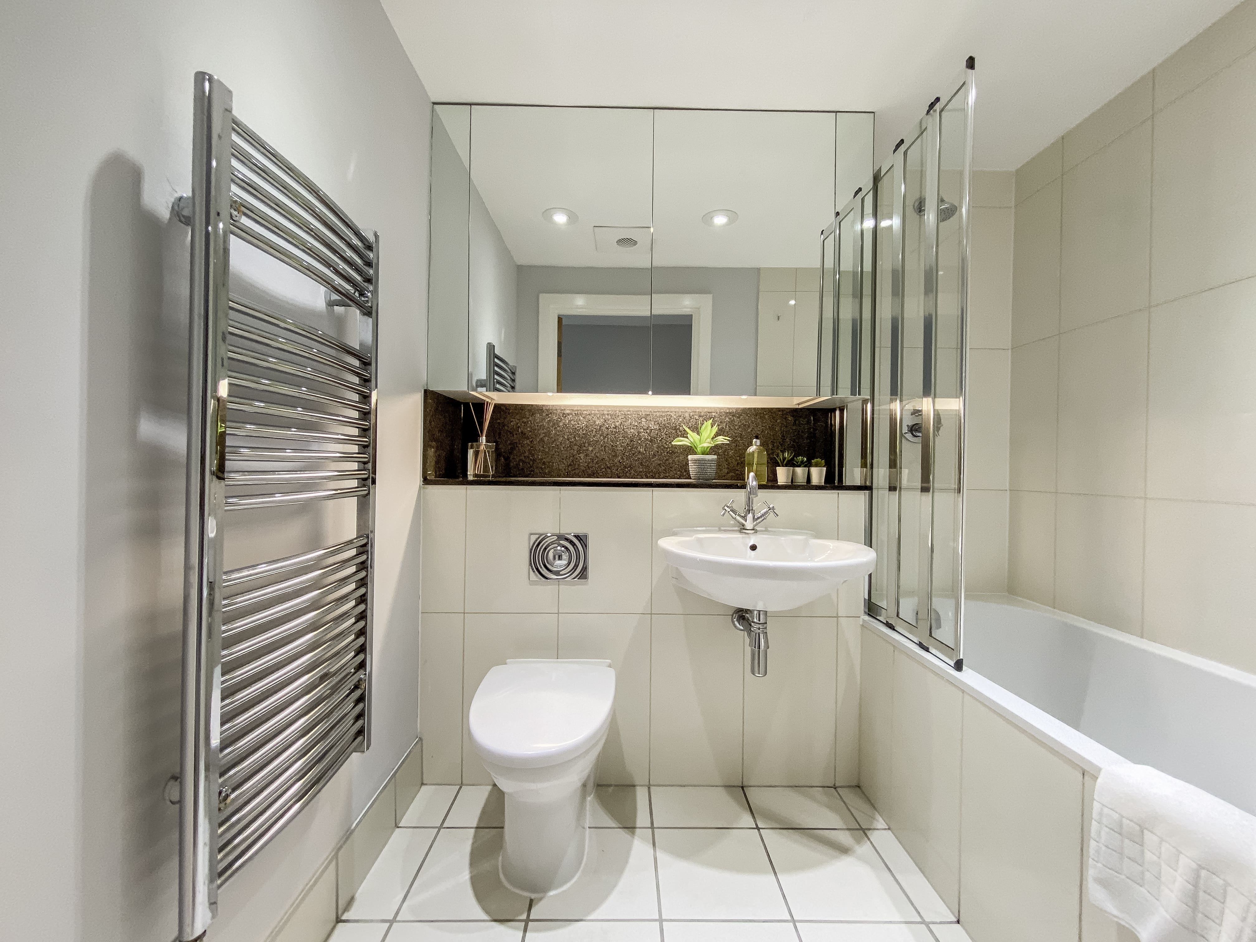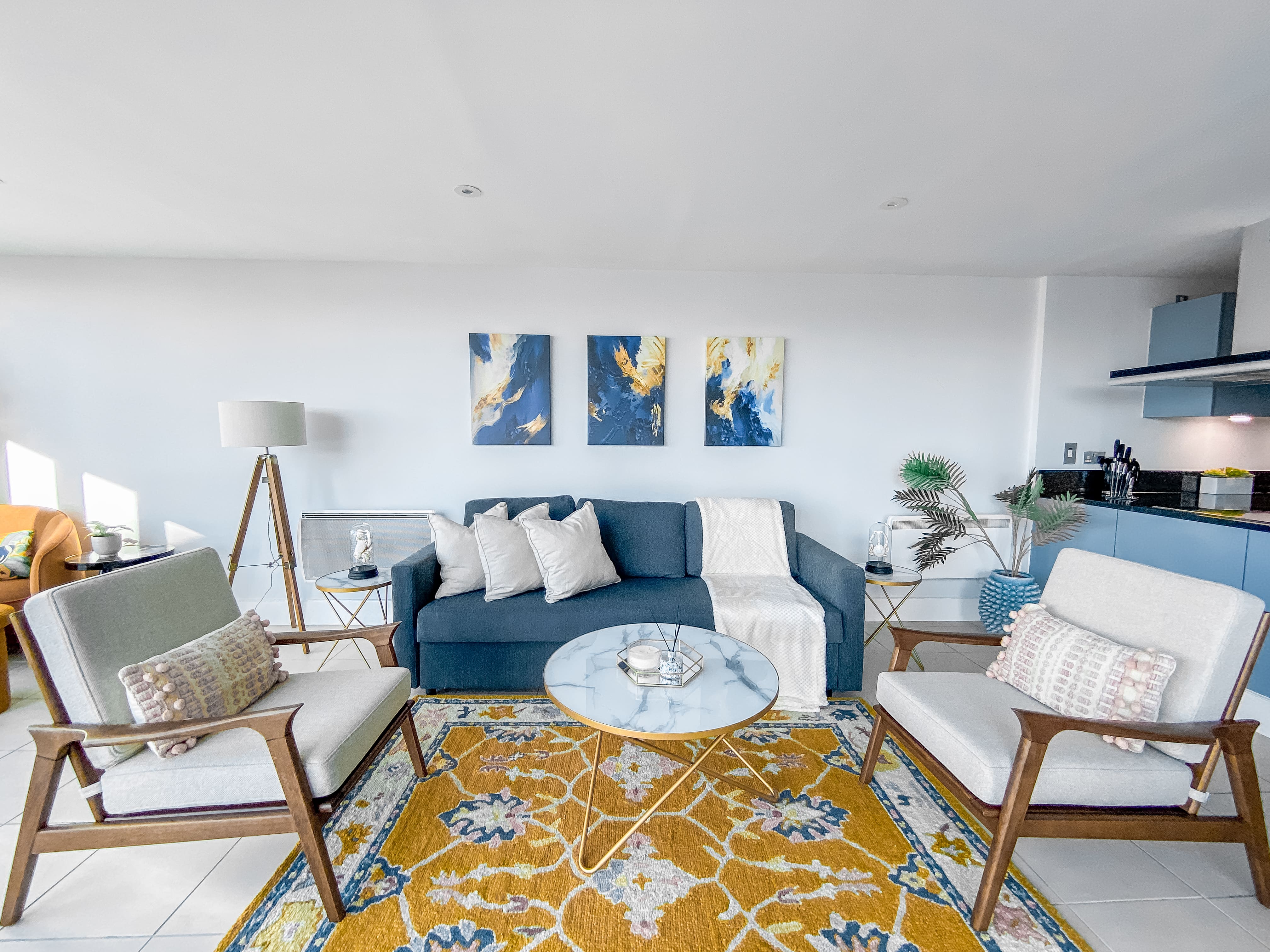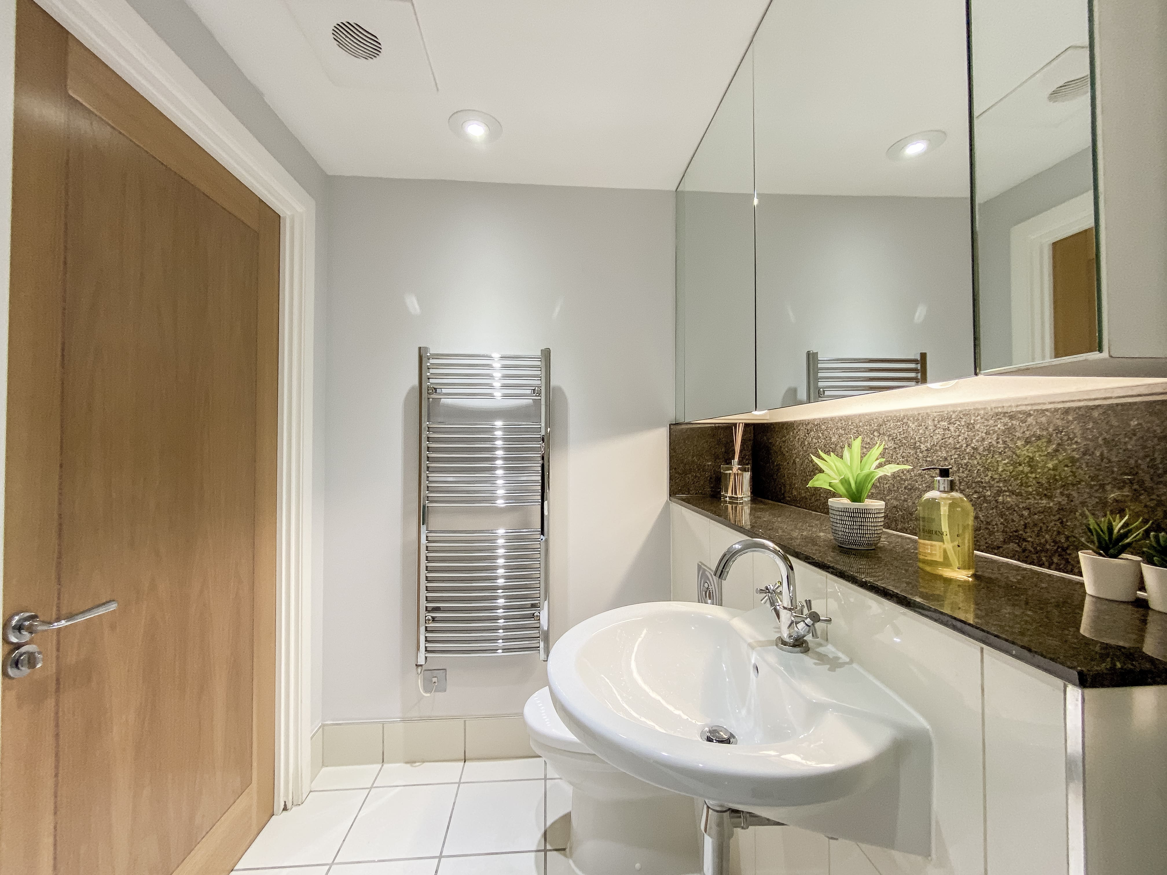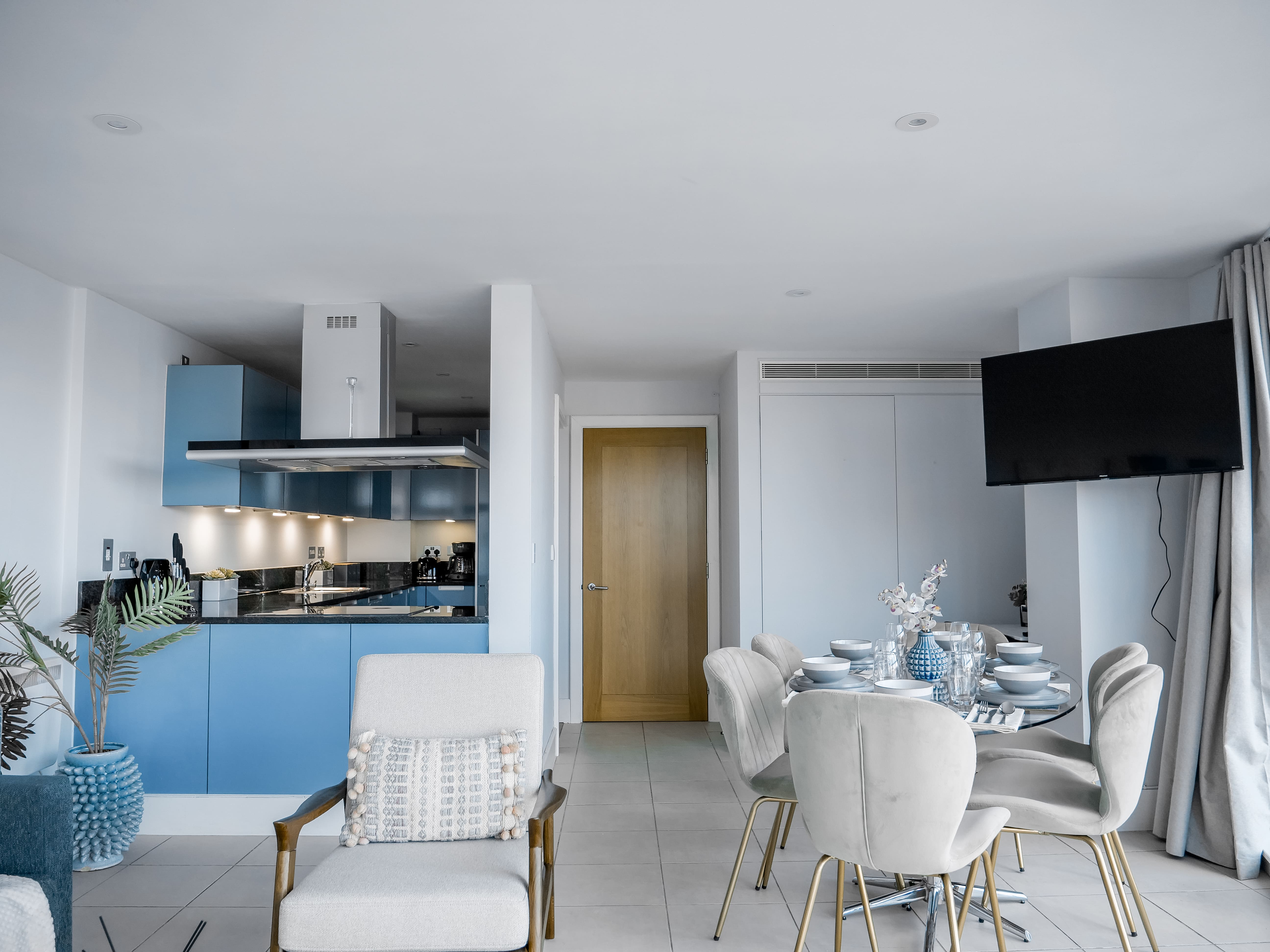The interior of this Vauxhall apartment is a masterclass in elegant design and functionality. With three spacious bedrooms, each with its own en-suite bathroom, the property comfortably accommodates up to six guests. The living area is a blend of style and comfort, featuring plush seating and a dedicated workspace for those needing to balance leisure with business. The modern kitchen is fully equipped with all essentials, including Nespresso capsules and other conveniences, ensuring a seamless start to your stay.