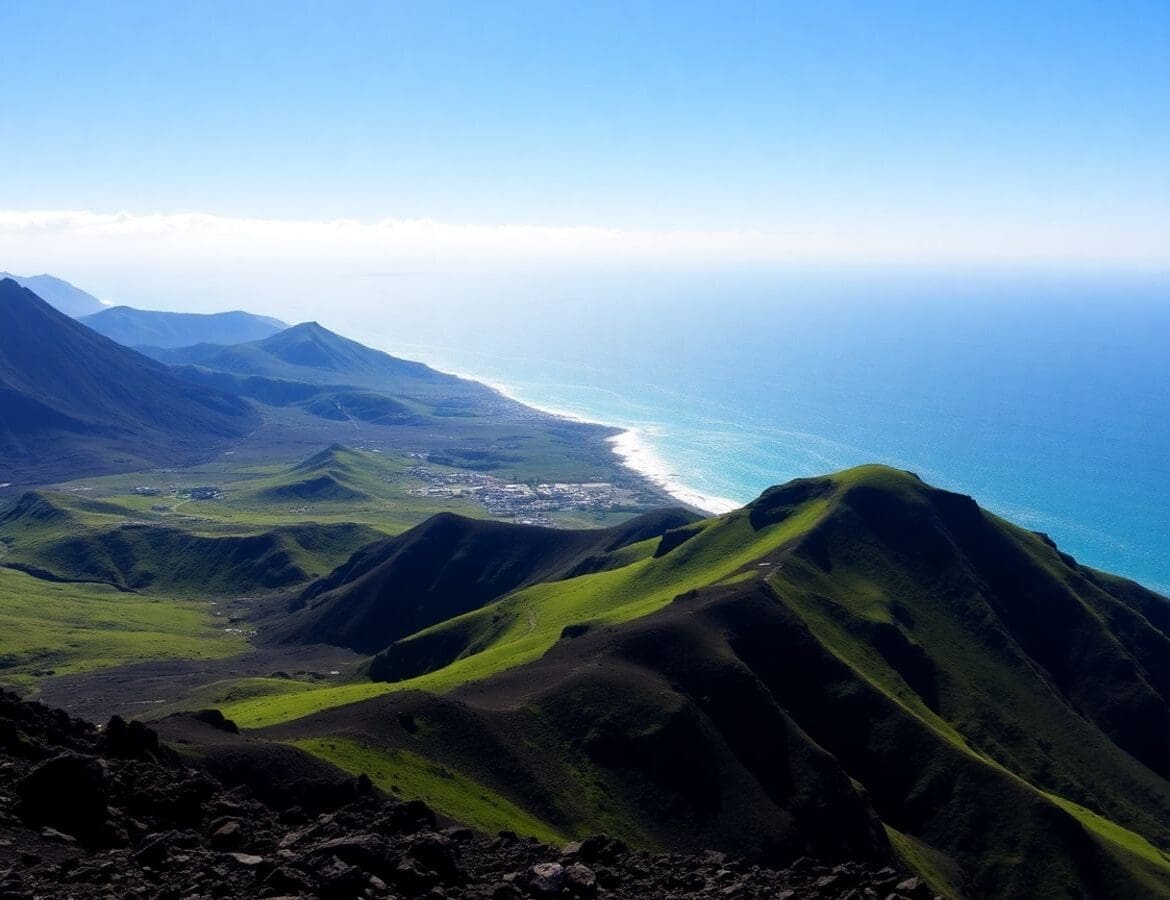 Costa cénica de Fuerteventura encontrando colinas verdes exuberantes.