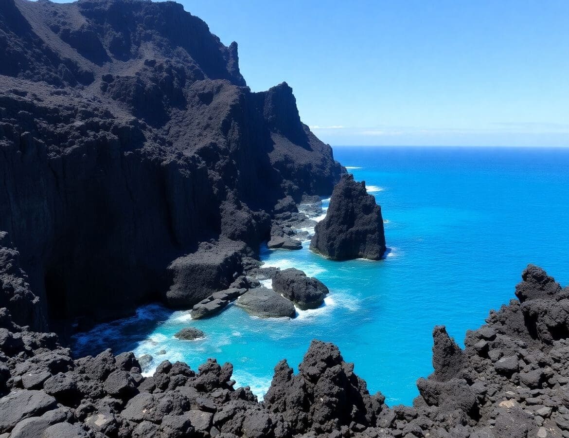 Costa vulcânica encontra mar turquesa sob céu azul.