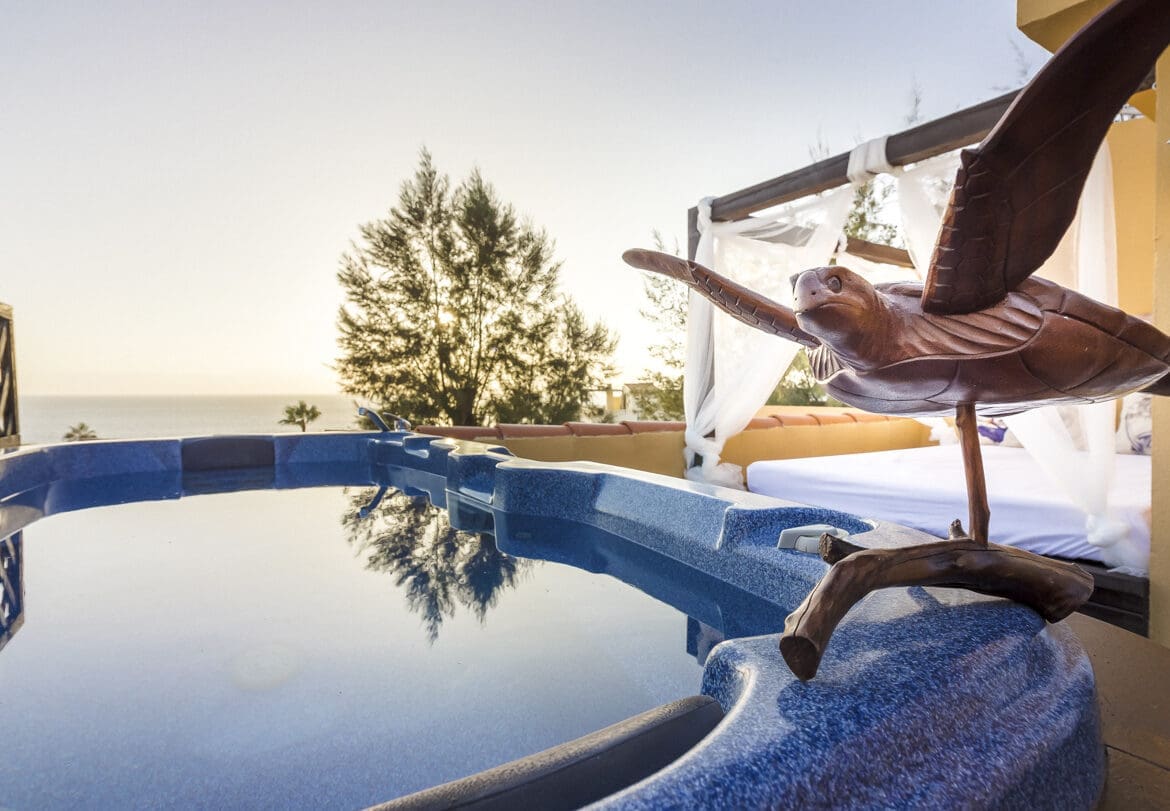 Finally, when you go up to the second floor of the property, you’ll find a big terrace with a panoramic view of the ocean! This part of the villa is perfect for relaxing as it’s the perfect chill out zone! It has another Balinese bed and here you can star gaze, top up on your tan and have a great place to rest while others use the jacuzzi! There is additional seating on the terrace.