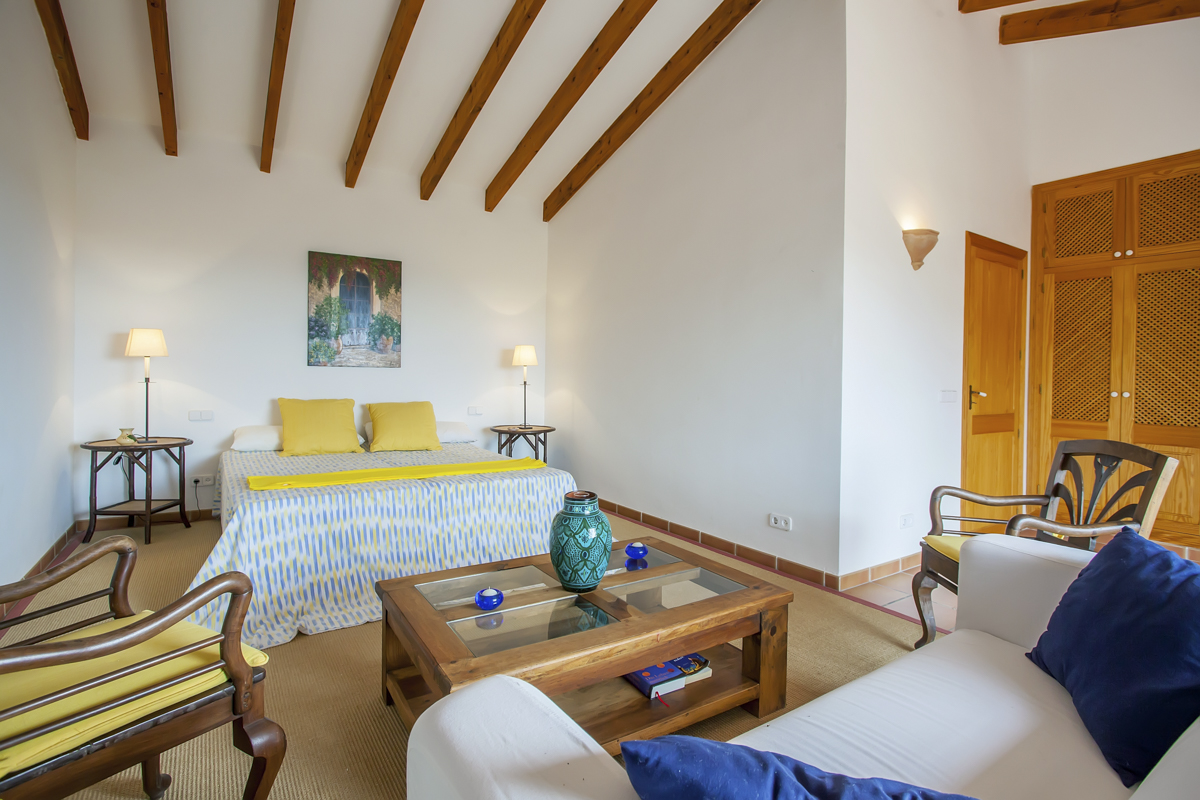 On the ground floor, you’ll find spacious living rooms, a dining room, games room, office and of course the kitchen. The kitchen has plenty of space to cater for your party; it’s modern but has lovely traditional touches, like the cheery blue and white Mallorcan tiles. There are exposed wooden beams throughout the villa, as well as stone floors and white walls – all to help keep you cool in the warmer months. Four of the bedrooms are here on the ground floor; two have en-suite bathrooms, and two share a bathroom.