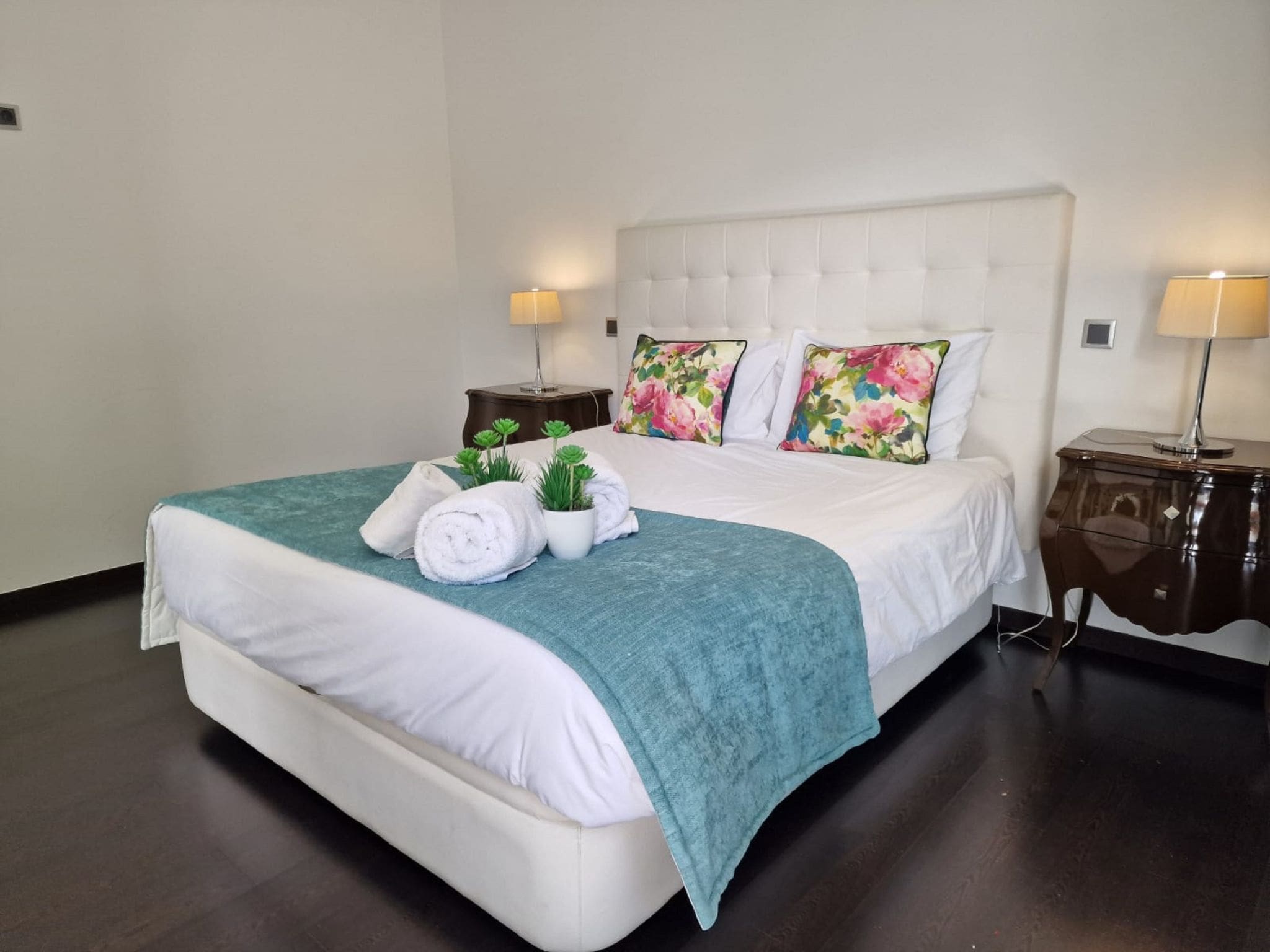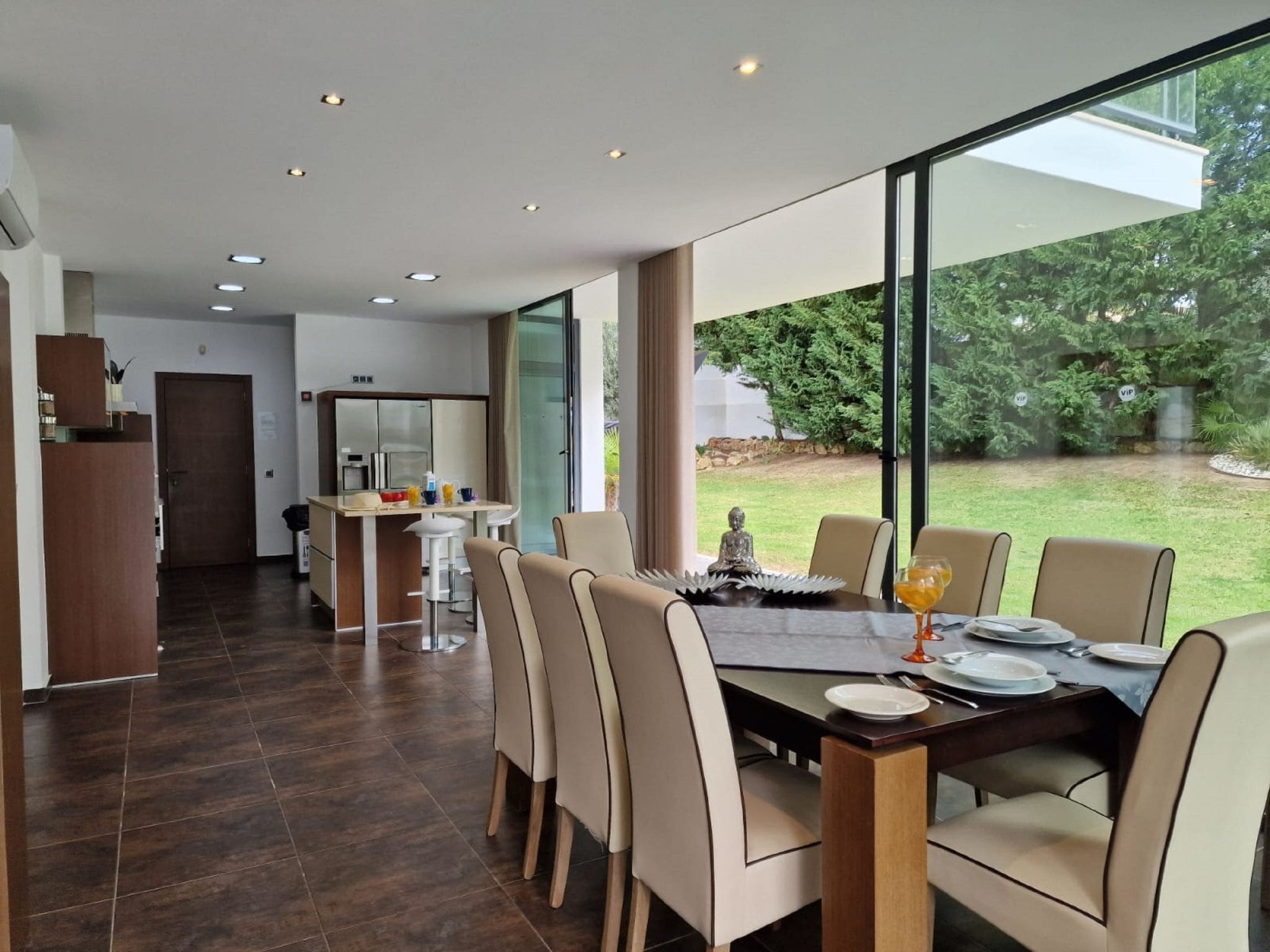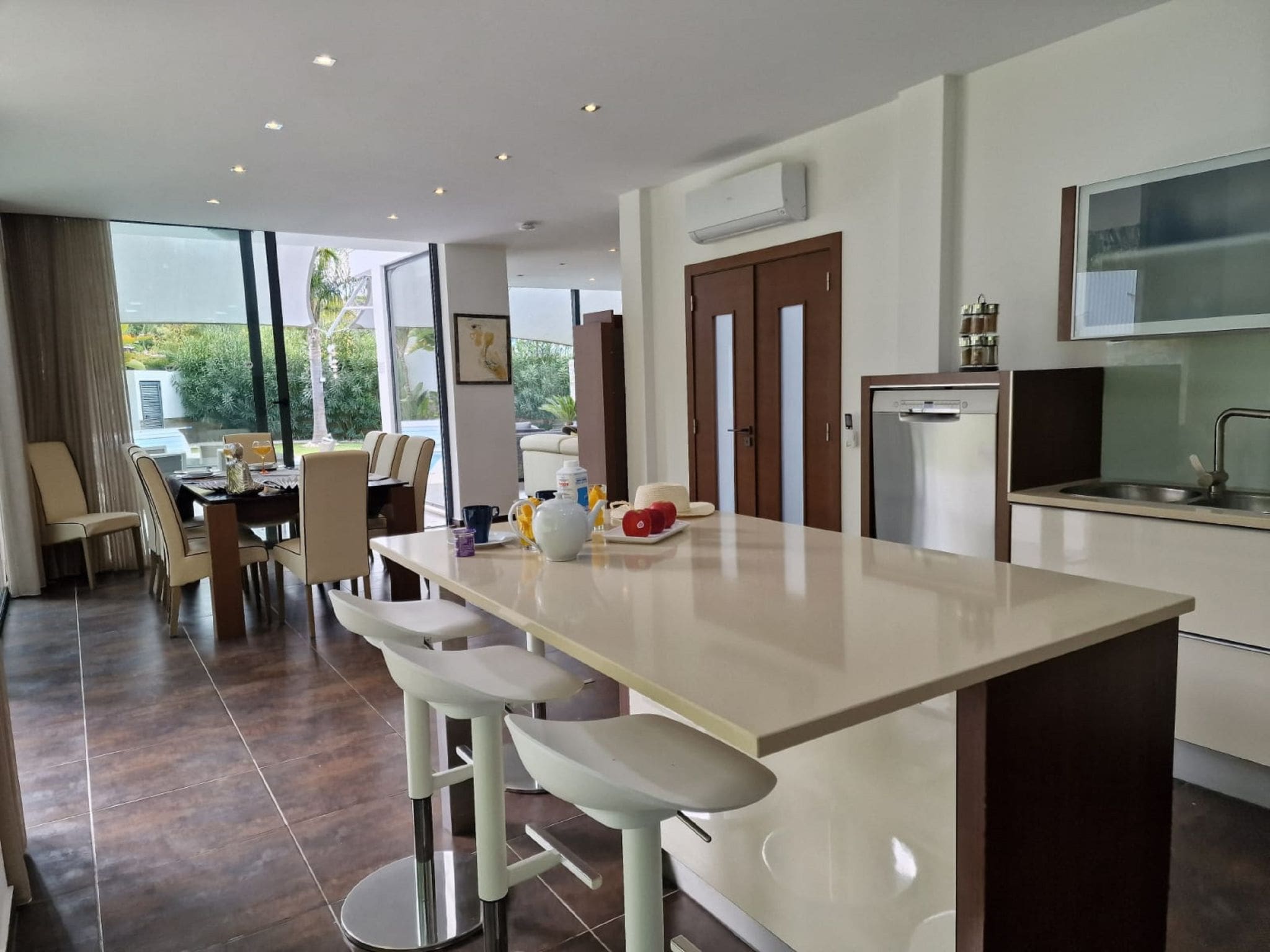 The open-plan living areas showcase contemporary Portuguese design with premium furnishings throughout. The spacious living and dining room features international satellite television and direct access to the pool terrace. The state-of-the-art kitchen centers around a striking cooking island, equipped with premium appliances including ceramic glass hob, dishwasher, and professional-grade coffee machine. Every room benefits from individual air conditioning and forced-air heating, ensuring year-round comfort.