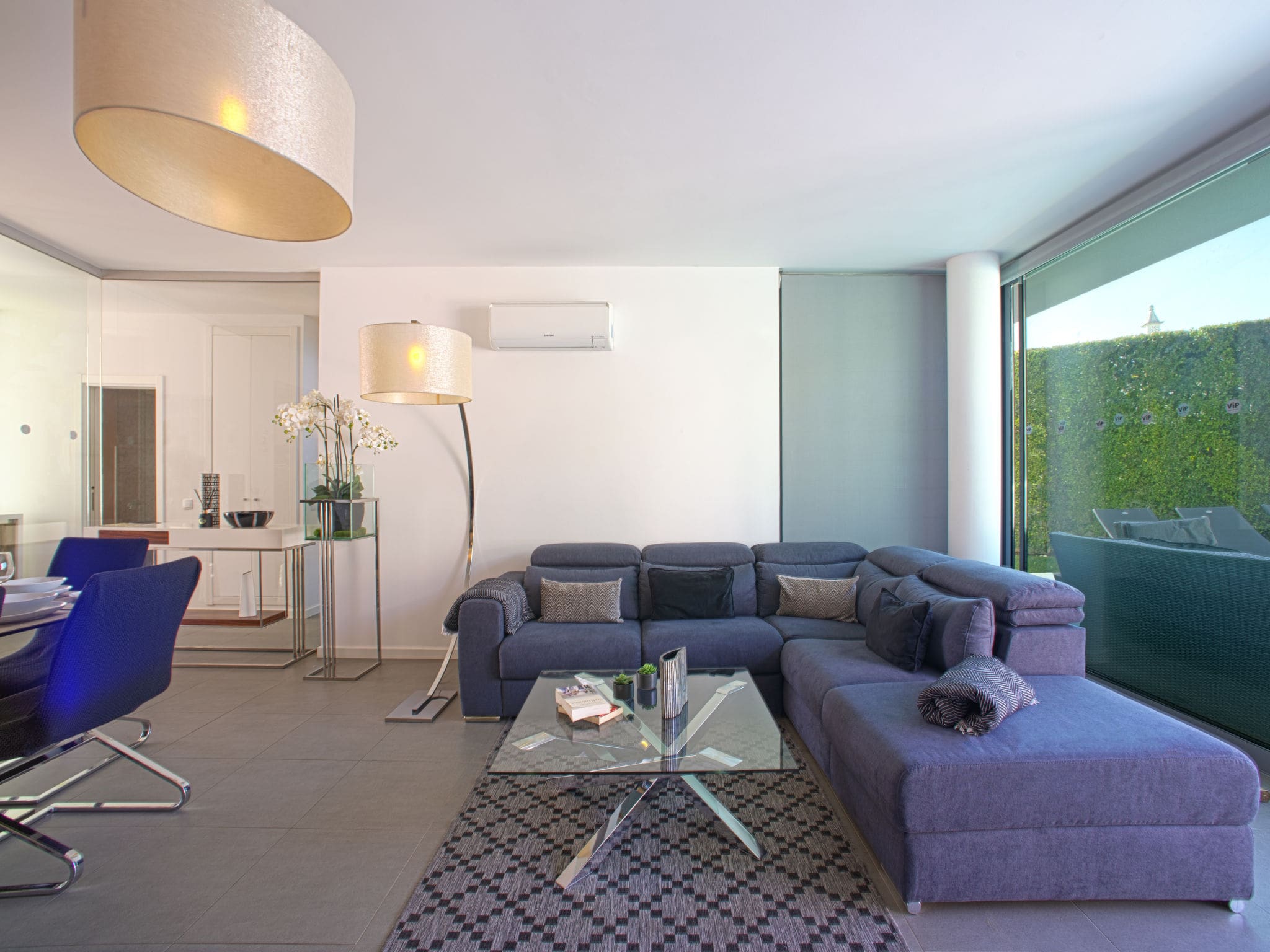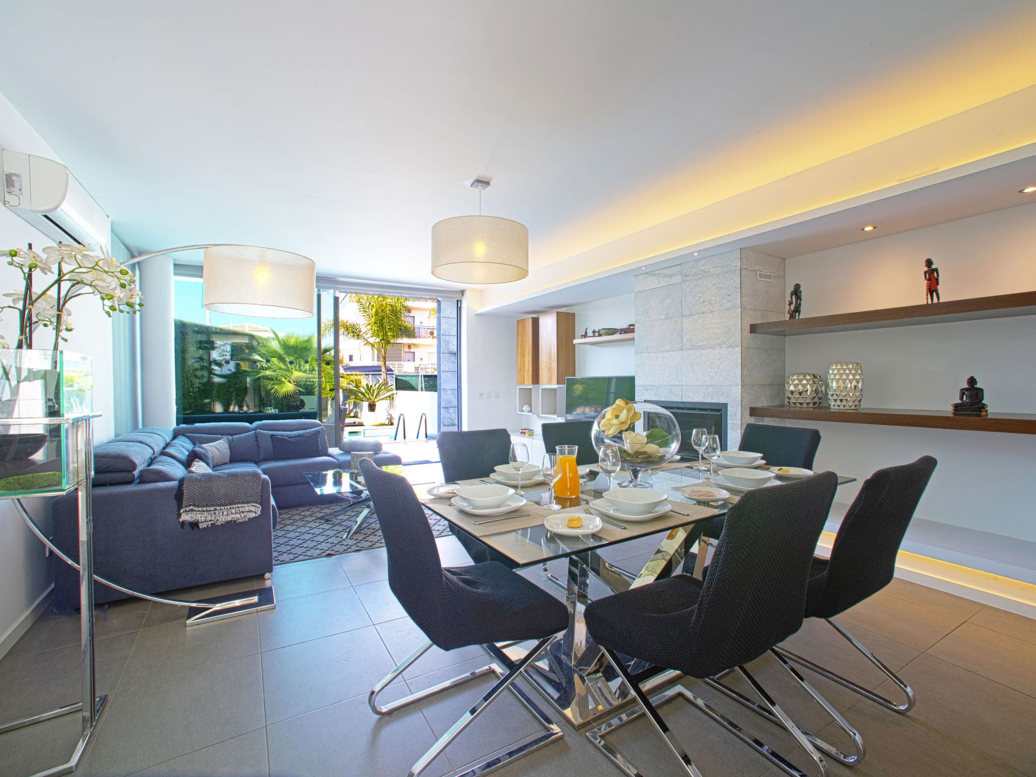 The single-level design creates a seamless flow throughout the 150-square-metre interior, where comfort and style converge in every carefully appointed space. The open-plan living and dining area features floor-to-ceiling windows that flood the space with natural light, while air conditioning ensures perfect temperatures year-round. Premium furnishings complement the contemporary aesthetic, with a state-of-the-art entertainment system including international TV channels for quiet evenings in.