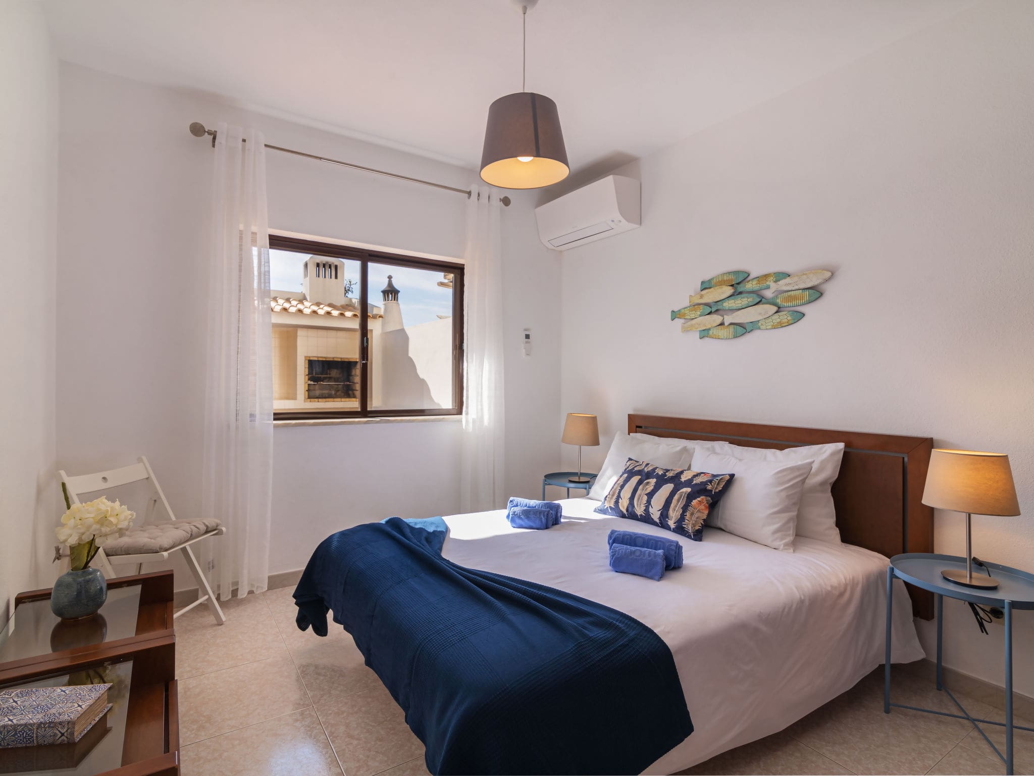 Four well-appointed bedrooms accommodate up to nine guests across both floors. The ground floor bedroom features a French bed, while the upper level houses three additional bedrooms, including a master with a double French bed and two twin-bedded rooms. All bedrooms benefit from air conditioning and heating, ensuring year-round comfort. Two contemporary bathrooms with showers and bidets serve the property, maintaining the high standards throughout.