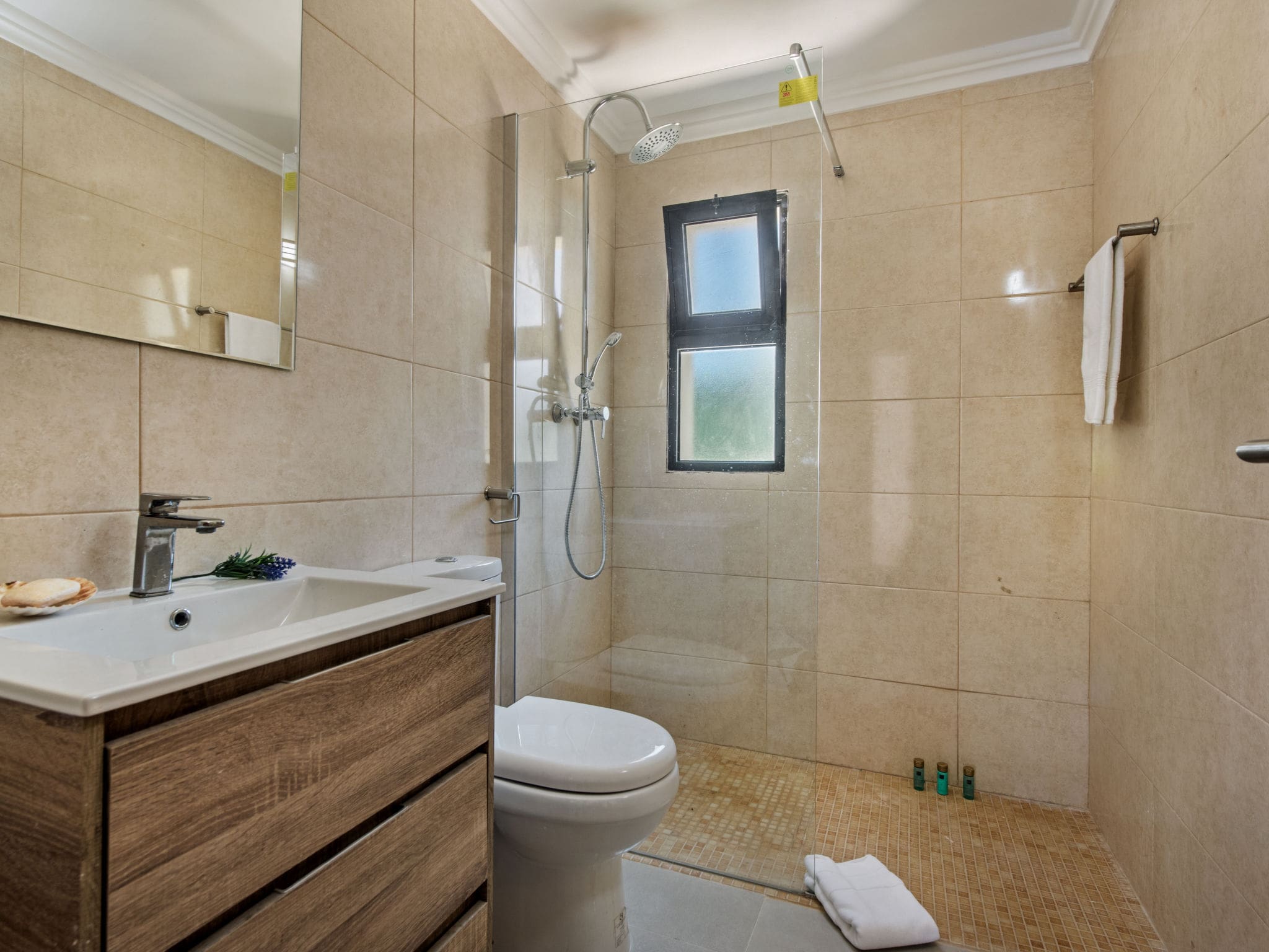 Spread across two thoughtfully designed levels, this 160-square-metre villa accommodates up to 8 guests in absolute comfort. The ground floor welcomes you with an inviting living and dining area featuring comfortable seating, flat-screen television with international channels, and air conditioning throughout. French doors open seamlessly to the terrace and pool area, creating a wonderful flow between indoor and outdoor living spaces.