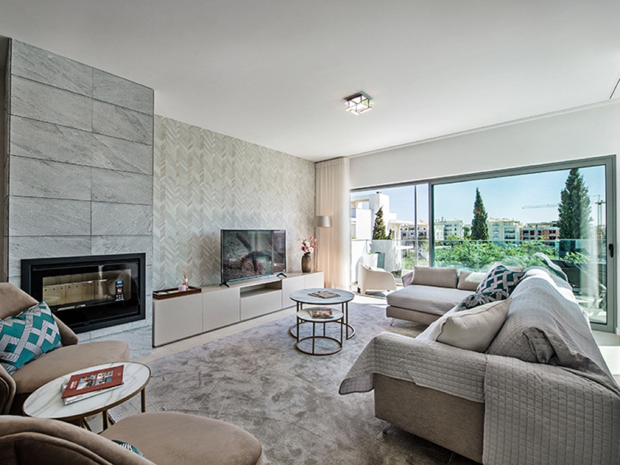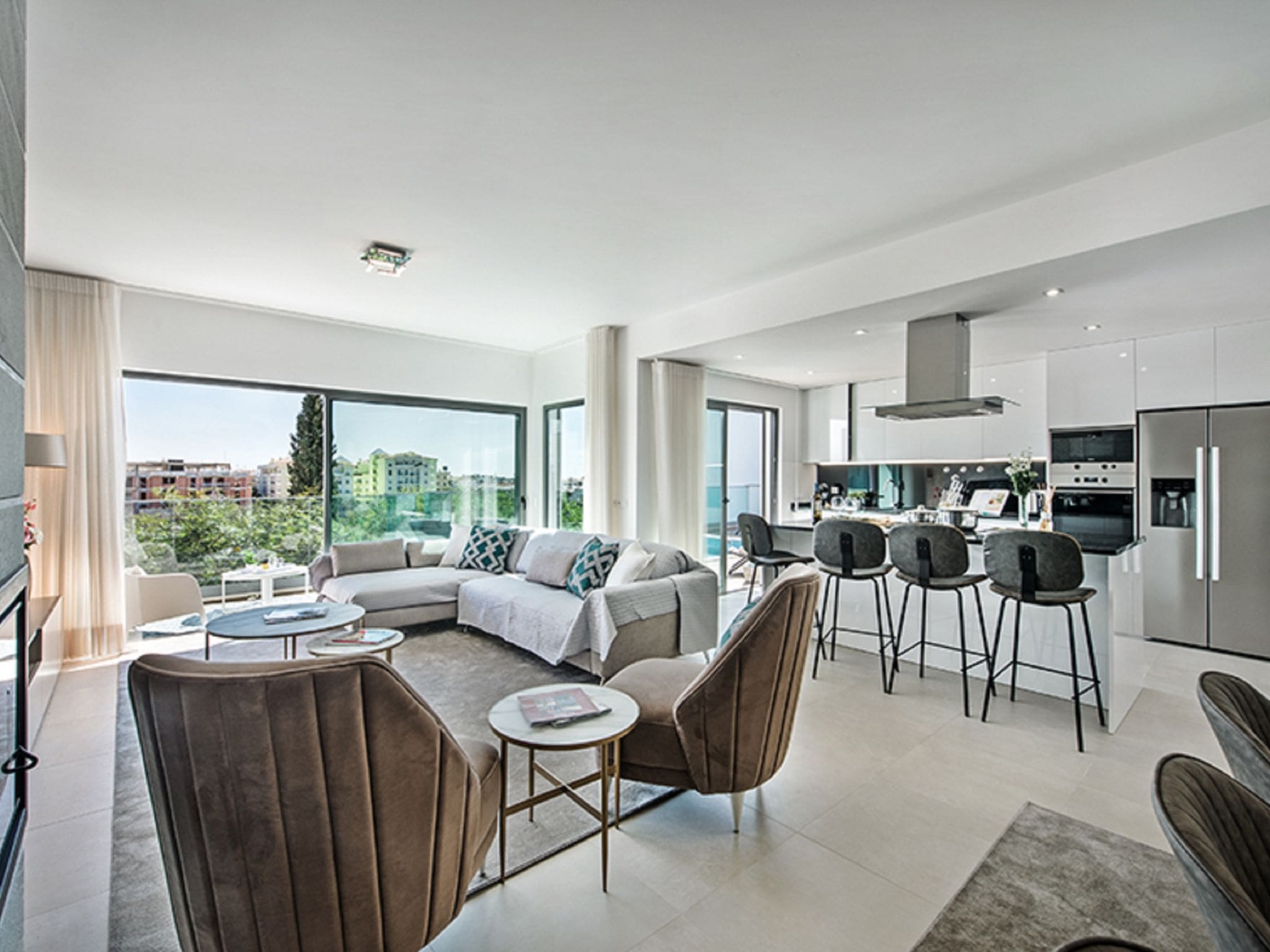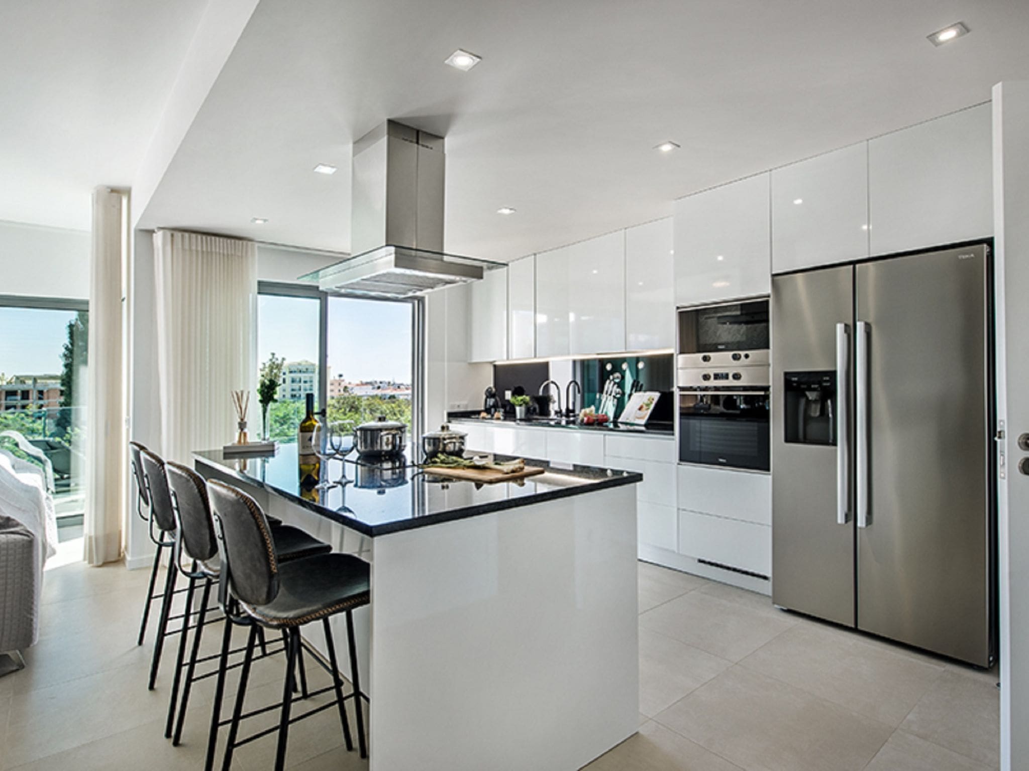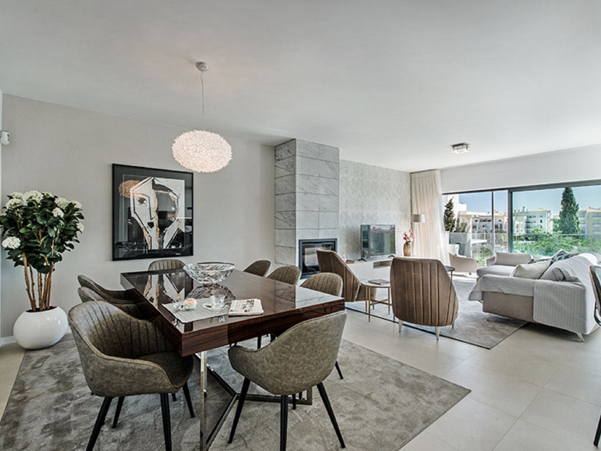 Spanning 245 square metres of thoughtfully designed living space across one level, this contemporary villa showcases sleek modern furnishings throughout. The open-plan living and dining area forms the heart of the property, featuring air conditioning, international cable television, and floor-to-ceiling windows that frame spectacular views across the resort to the Atlantic Ocean beyond. The seamless flow between indoor and outdoor spaces creates an atmosphere of relaxed luxury perfect for Portuguese coastal living.