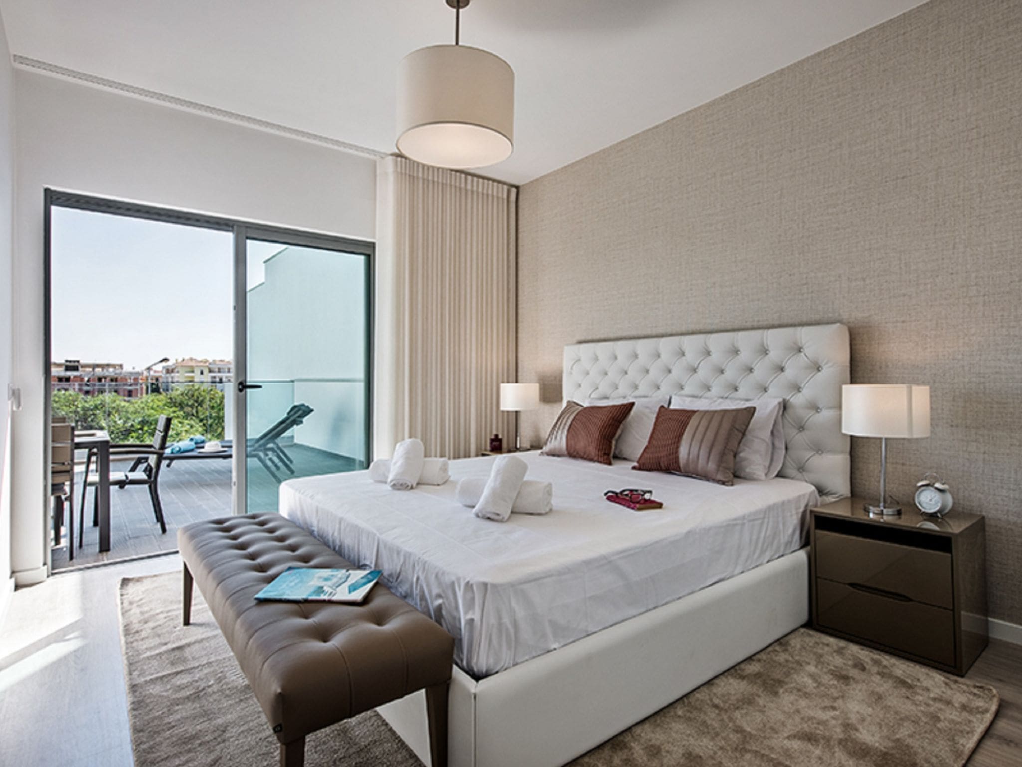 Three comfortable bedrooms accommodate up to six guests in style. The master suite includes an ensuite bathroom and direct terrace access, while the second double bedroom also opens onto the outdoor areas. A flexible twin bedroom provides additional sleeping arrangements, with all rooms featuring air conditioning and quality furnishings. Two well-appointed bathrooms include both bath and shower facilities, with one offering a relaxing bathtub for unwinding after days exploring the Algarve coastline.