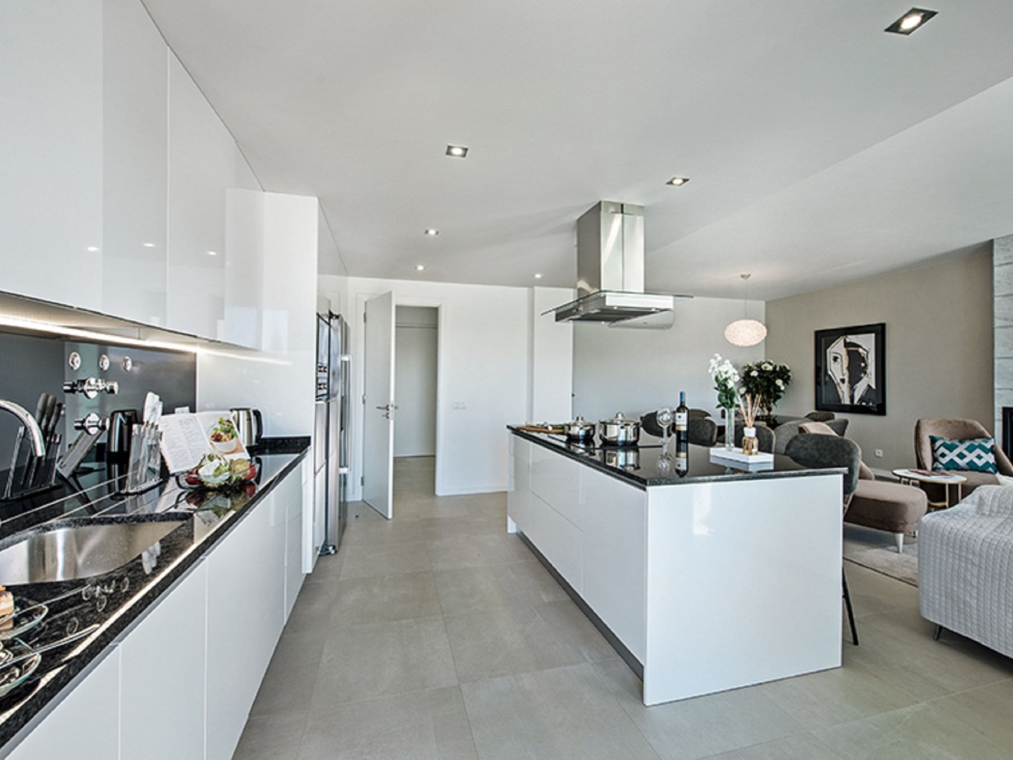 The fully equipped kitchen showcases modern appliances including a dishwasher, ceramic hob, oven, microwave, and convenient cooking island. Premium touches throughout include double-glazed windows, LED lighting, and complimentary WiFi connectivity.