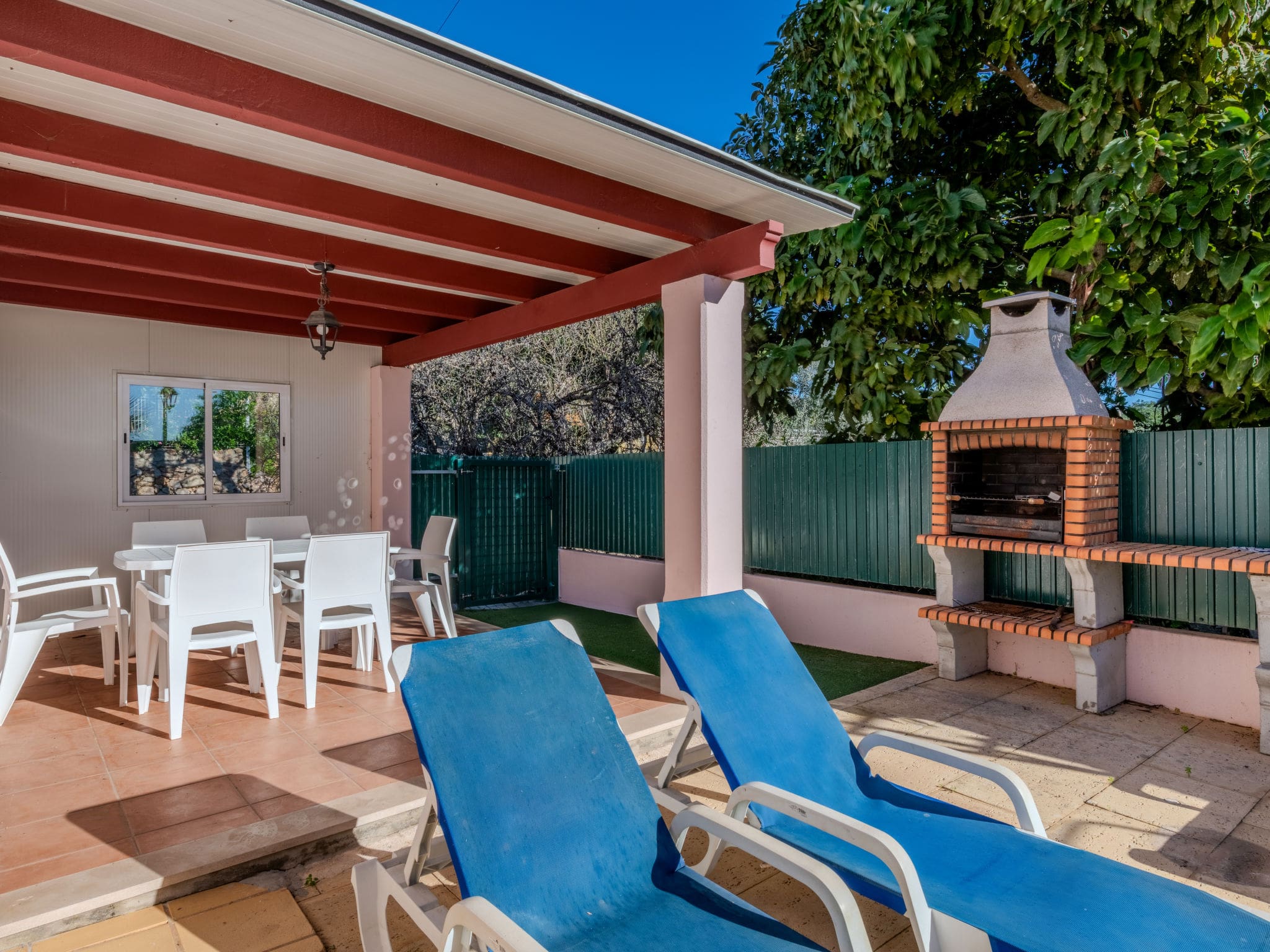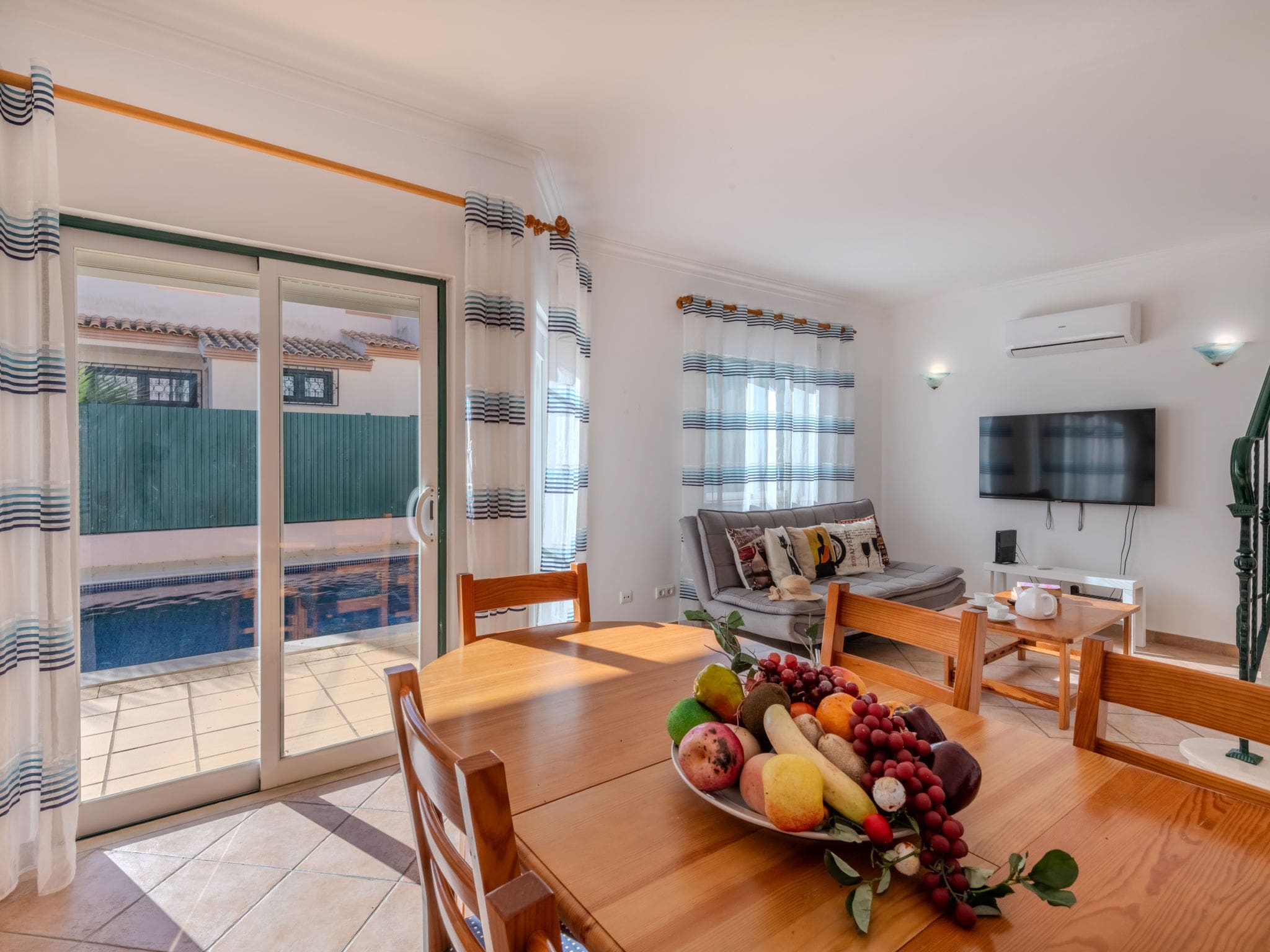 The private courtyard forms the heart of outdoor entertainment, centred around an angular swimming pool measuring 3 by 8 metres with depths ranging from 90 to 180 centimetres. Available throughout the year, the pool provides refreshing respite during warm Portuguese days and gentle exercise opportunities for all ages. Furnished terraces surrounding the pool area create perfect spaces for al fresco dining, while the built-in barbecue facilities encourage evening gatherings under the Algarve stars.