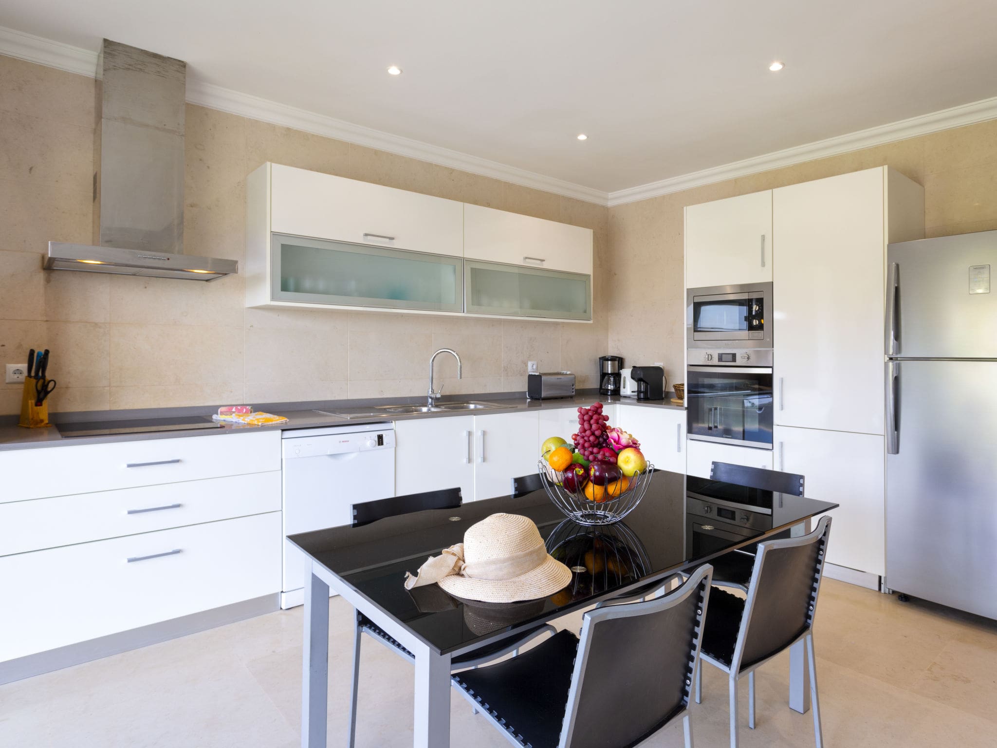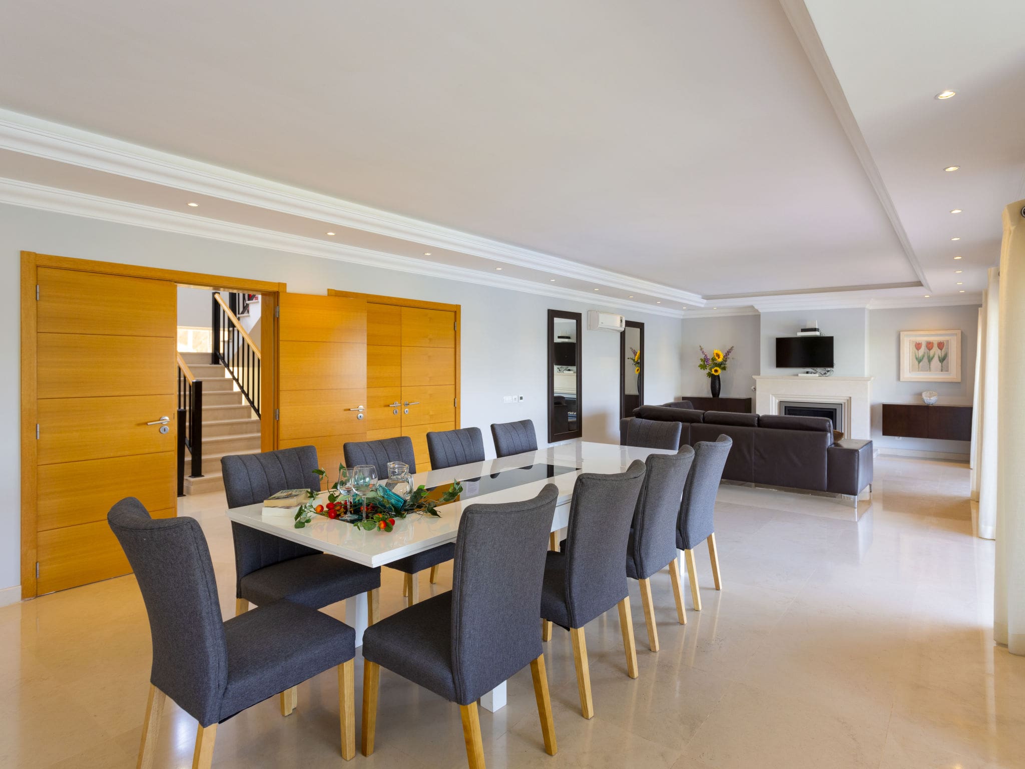 The villa spans two thoughtfully designed levels, featuring a magnificent living and dining area that serves as the heart of the home. Floor-to-ceiling windows flood the space with natural light while offering seamless access to the outdoor terraces and pool area. The fully equipped kitchen includes premium appliances, including a dishwasher, ceramic hob, microwave, and electric coffee machine, making it ideal for both intimate family meals and larger gatherings.