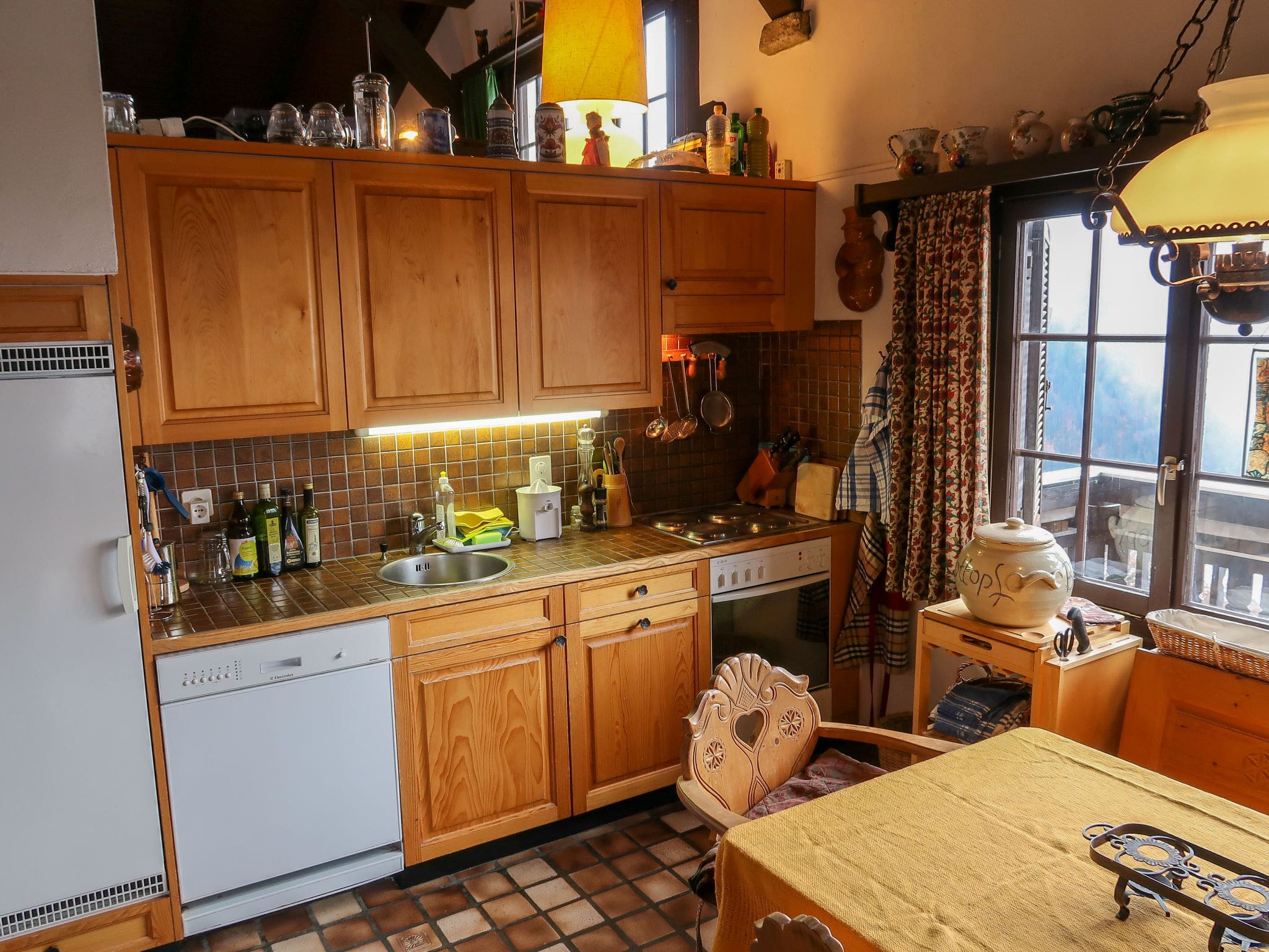 The chalet’s rustic yet refined interiors create an atmosphere of cosy sophistication throughout its 160 square metres. The heart of the home centres around the welcoming living and dining area, where an impressive open-hearth fireplace provides warmth and ambience on crisp mountain evenings. Floor-to-ceiling windows flood the space with natural light while framing spectacular views of the surrounding peaks and valley below. The open-plan kitchen features modern appliances including a four-plate hob, oven, and dishwasher, perfect for preparing hearty alpine meals.