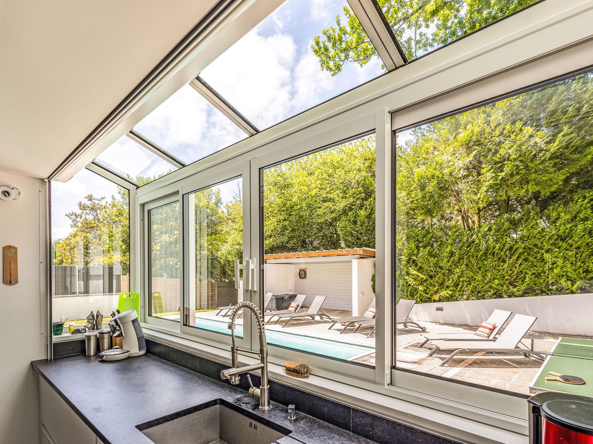 The villa’s outdoor spaces truly distinguish this property from other accommodations in the region. A magnificent 9,500-square-metre garden provides ample space for children to play and adults to relax in complete privacy. The heated swimming pool measures four by nine metres and operates from June through September, featuring an internal staircase and protective cover for safety and maintenance.