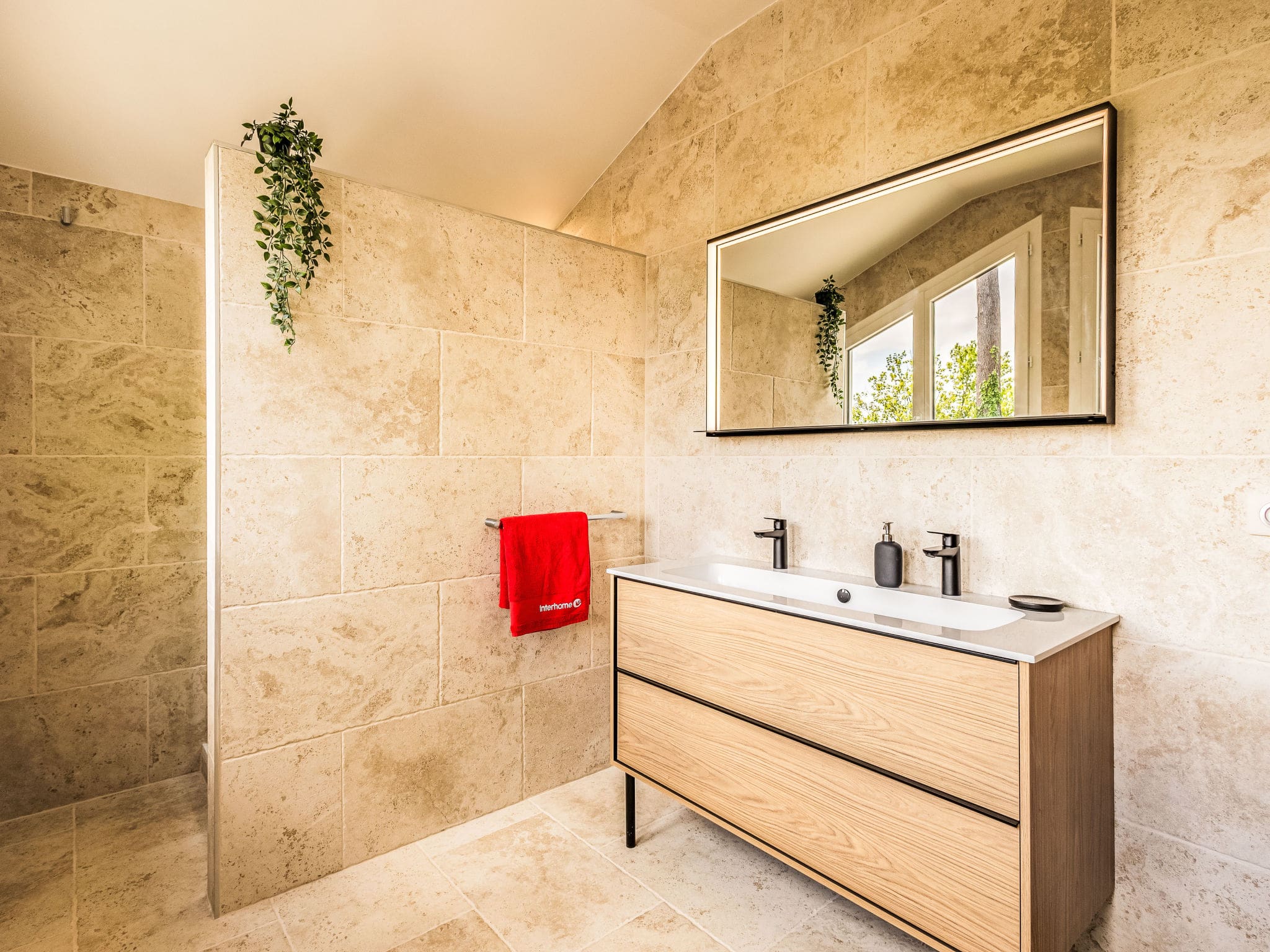The open-plan kitchen showcases modern convenience with induction cooking, a dishwasher, microwave, and Senseo coffee machine. Direct access from both the kitchen and living areas leads to the terrace and pool, creating seamless indoor-outdoor living. Four thoughtfully designed bedrooms accommodate up to eight guests, including a master suite with dressing room, en-suite shower, and double washbasins. The additional bedrooms offer flexible sleeping arrangements, from French double beds to twin singles, ensuring comfort for various group configurations.