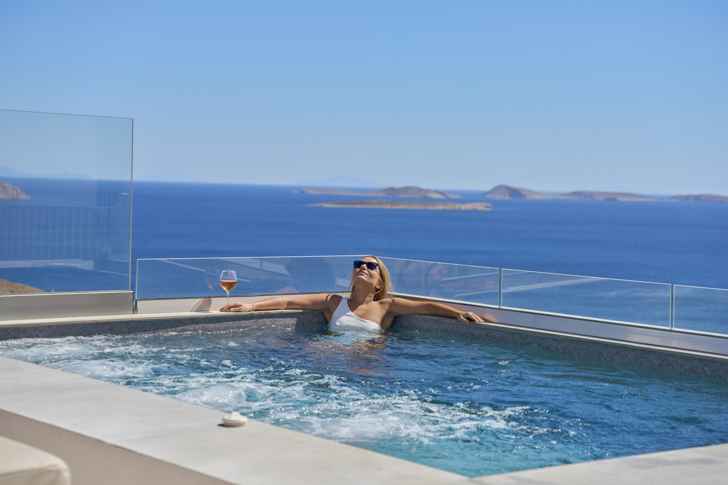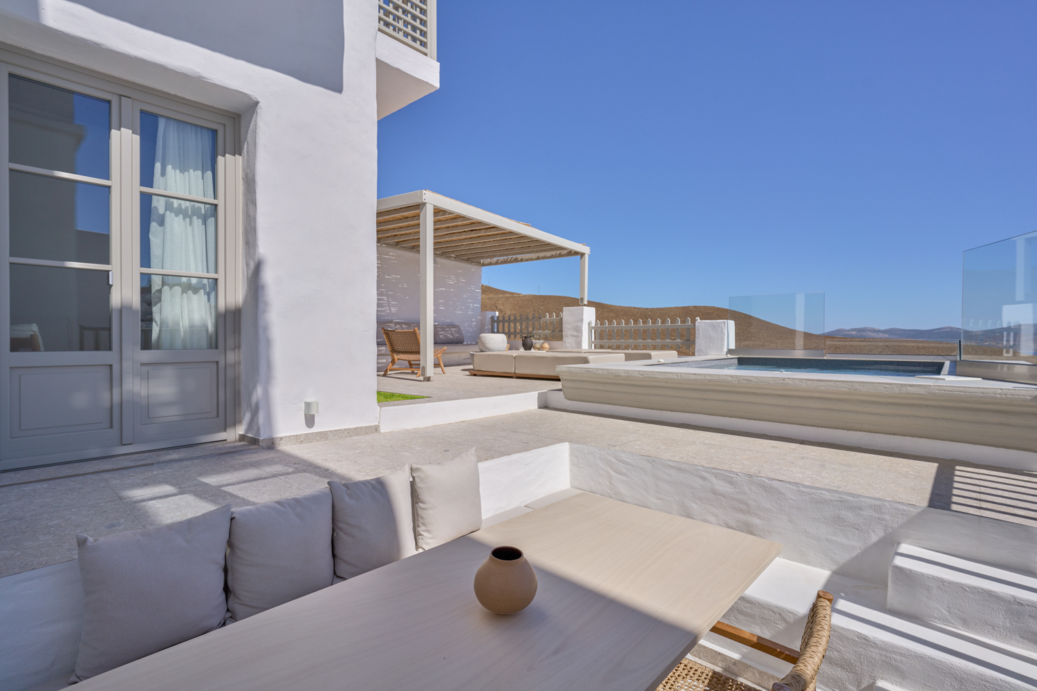 Beyond the inviting interiors, the villa’s allure extends to the marvellous terrace offering a stunning sunken al fresco dining setting, shaded seating area, sun beds and a picture-perfect plunge pool. Here, against the backdrop of the Aegean Sea, you can enjoy leisurely breakfasts or unwind with a glass of local wine under the vast firmament of the Grecian sky.