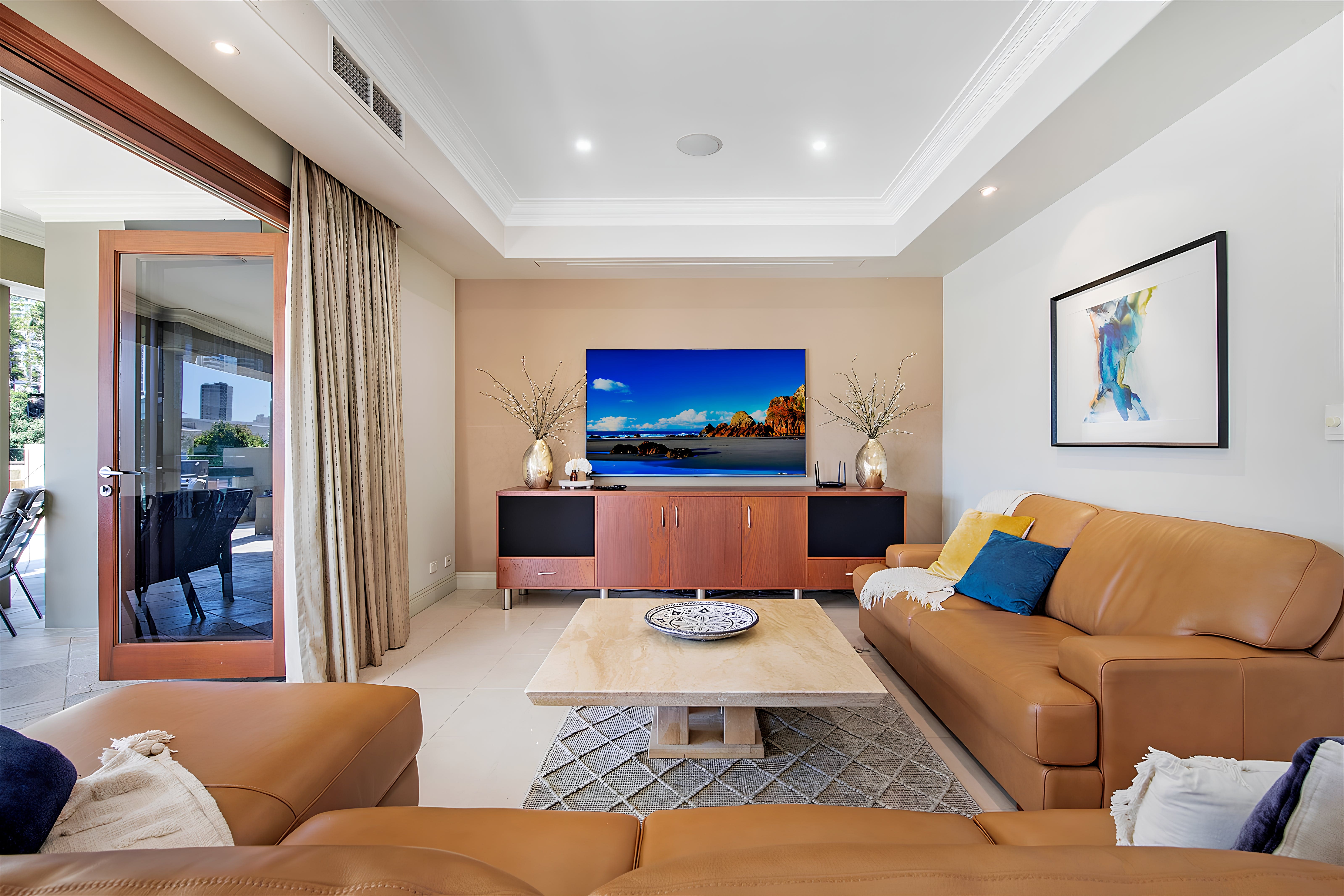 The outdoor spaces are a highlight of this villa, offering breathtaking views of the Queensland coastline. The swimming pool is a focal point, perfect for leisurely swims under the Australian sun. The expansive terrace provides an ideal setting for alfresco dining, complete with a BBQ area for culinary enthusiasts. As the sun sets, enjoy a refreshing drink while taking in the stunning seaviews that this location offers.