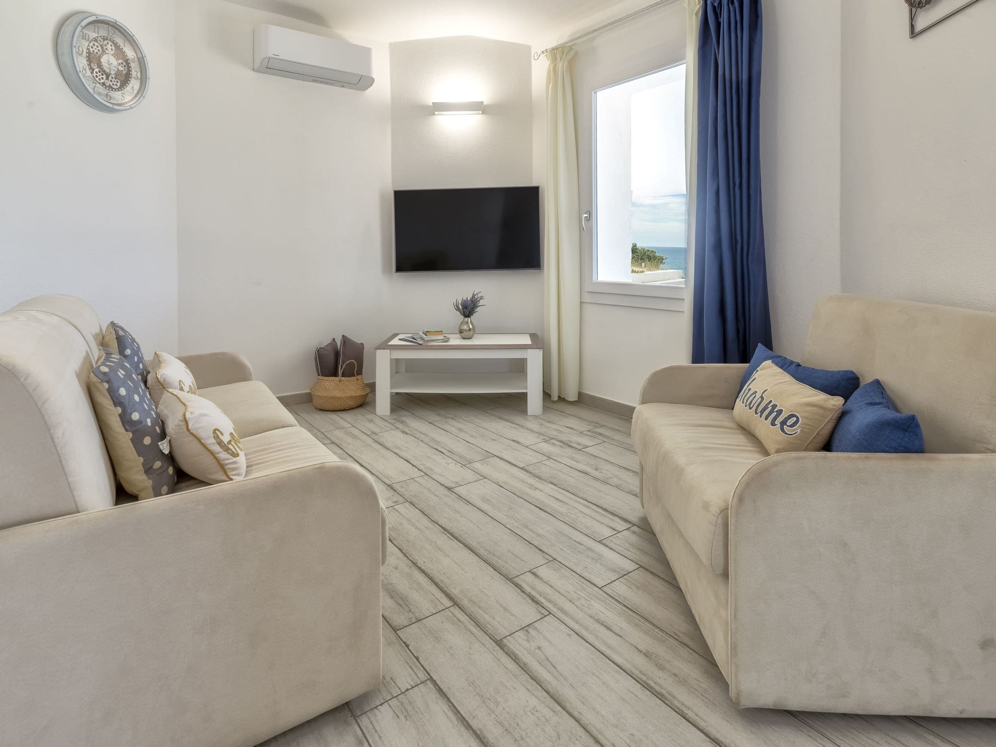 The villa’s elevated position provides breathtaking sea views and captures the refreshing north-west breezes that make this stretch of coast so appealing. The generous 80m² covered patio serves as an outdoor living room, furnished with comfortable terrace furniture and three deck chairs for soaking up the Mediterranean sunshine. The expansive 2,000m² private grounds offer plenty of space for children to play safely, while the elevated setting ensures privacy and tranquillity. With the golden sands of Li Junchi beach just a two-minute walk away, you can easily alternate between the villa’s peaceful terraces and the crystal-clear waters of the Mediterranean.