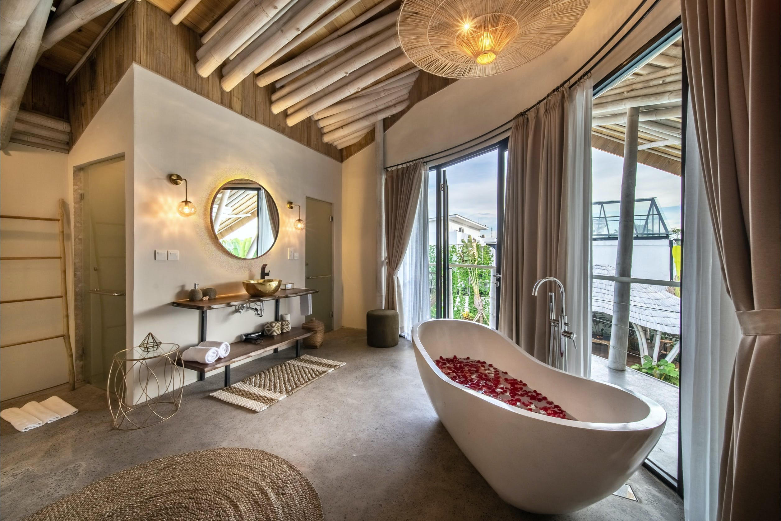 Experience the epitome of tropical luxury at this exquisite luxury villa rental in Bali, where architectural innovation meets serene surroundings. Nestled in the vibrant locale of Bali, this villa offers a unique retreat crafted entirely from bamboo, providing a distinct blend of contemporary design with traditional elements.