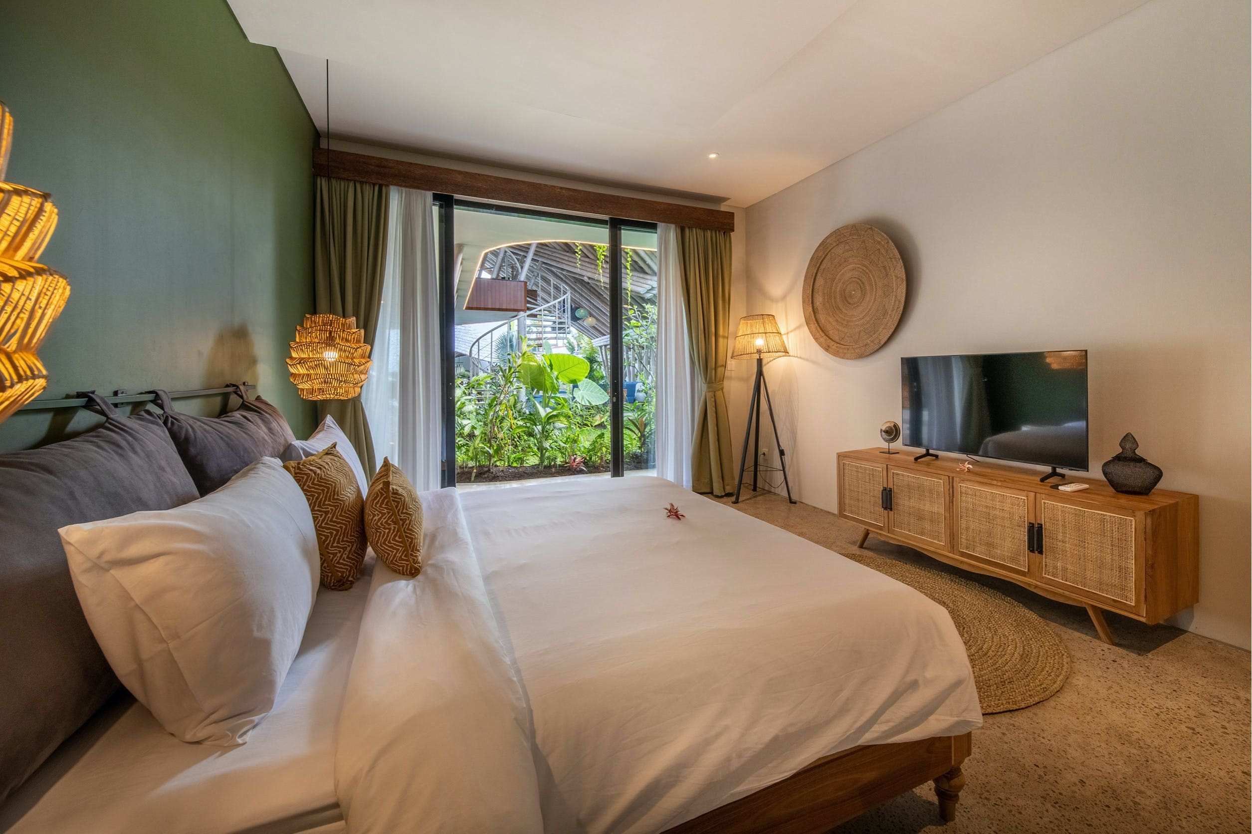 Step into the villa’s open-air interiors, where every detail has been thoughtfully curated for comfort and style. With five spacious bedrooms, each equipped with air conditioning, guests are ensured a restful night’s sleep. The villa’s living areas offer an airy ambiance, with a beautiful staircase leading to the second floor. Here, guests can enjoy an impressive view of the volcano on clear days. The media room, which includes a sofa bed, provides additional space for relaxation or for accommodating extra guests.