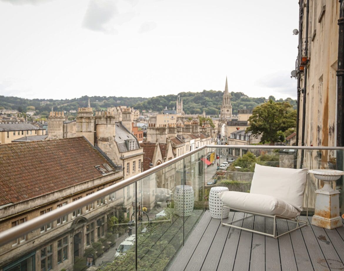 Situated on one of Bath’s most famous streets, this stunning, spacious Grade I-listed Georgian townhouse has the wow factor and then some. The highlight for us has to be the outdoor space. Step out through French doors in the living room to the upper balcony with wrap-around glass balustrades offering panoramic views across this elegant city’s skyline to Bath Abbey and the wooded hills beyond. We love this spot – watch the world go by in the artisan quarter of Walcot Street below as you sip a glass of Champagne. There’s also a roof terrace – this wonderful suntrap is perfect for alfresco dining.