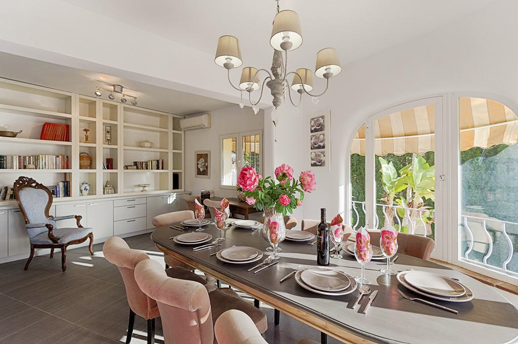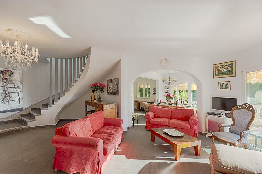 The large outside space at Villa Delia spans three levels. The lawned Mediterranean garden is found on the lower level, and from here, steps take you up to the pool terrace. This entire area has been designed for luxurious outdoor living. Your private pool is a generous size, with broad curved steps leading you down into the refreshing water for a swim. Alongside it you have sun loungers facing the breath-taking view of the sea and mountains and the most wonderful covered pool-side kitchen area, complete with table, chairs and barbecue. The outdoor shower allows you to freshen up between sun bathing, swimming, lunch on the terrace and a siesta. The covered terrace running behind the pool area features three graceful arches through which you can admire the view from a sizeable al fresco dining area.