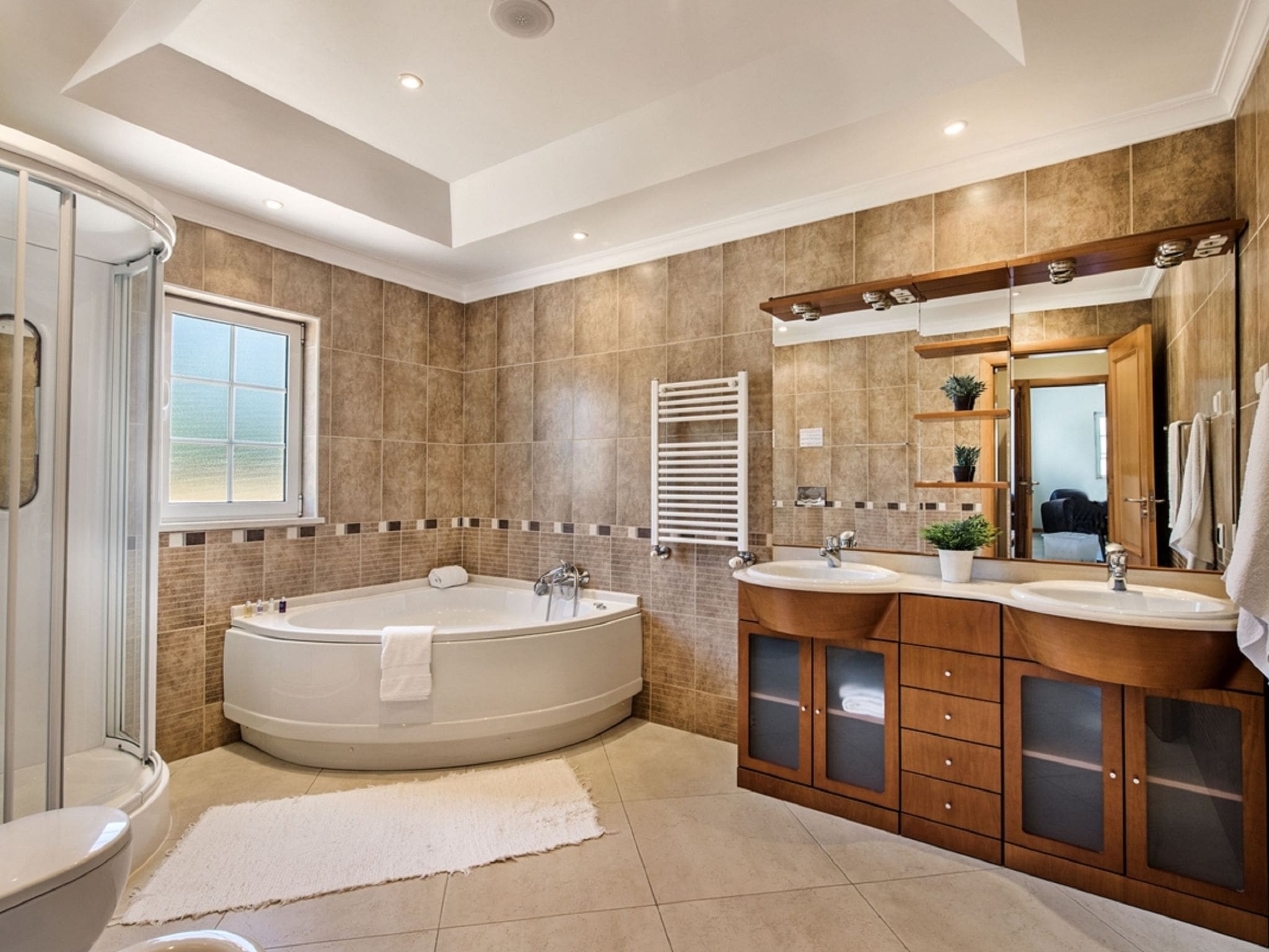 Spanning 362 square metres across two thoughtfully designed levels, this stunning property accommodates up to 12 guests in six beautifully appointed bedrooms, each with its own bathroom. The ground floor welcomes you with an elegant living and dining area featuring modern amenities including cable television with international channels and climate control throughout. French doors open onto the terrace, creating a seamless flow between indoor and outdoor living spaces.
