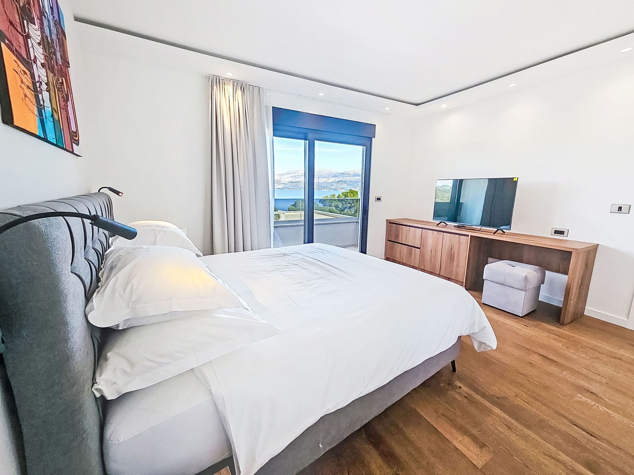 The master bedroom on the ground floor provides intimate luxury with a comfortable French bed, private ensuite shower room, satellite television, and direct terrace access. Upstairs, two additional bedrooms each feature spacious French beds, private bathrooms, air conditioning, and access to a private balcony offering spectacular sea views across the azure Adriatic towards the mainland coast.