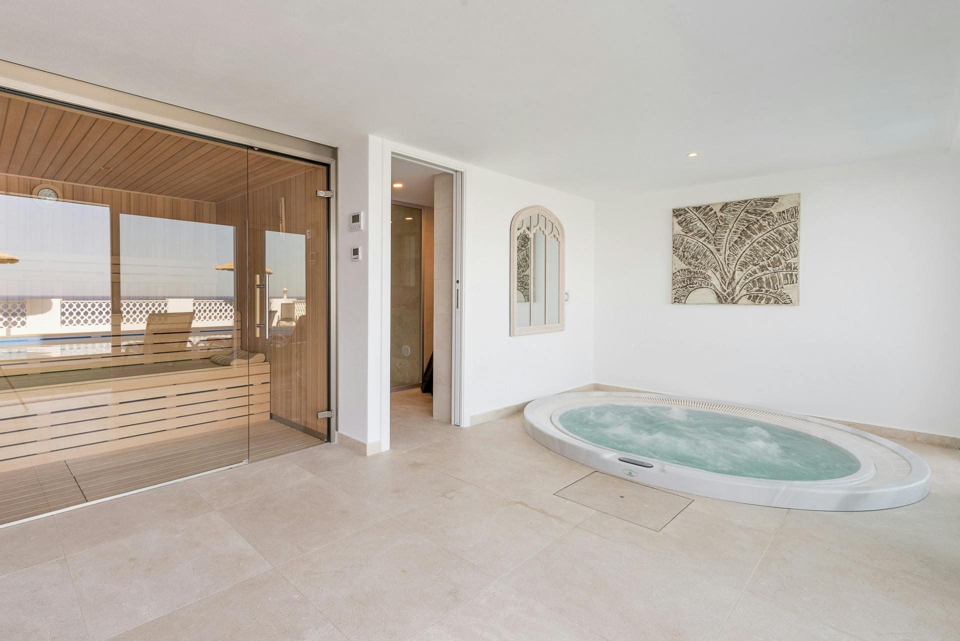 Outside, the villa boasts multiple terraces, each offering unique vistas of the shimmering Mediterranean. The private swimming pool is a focal point for leisurely days under the sun, complemented by a luxurious hot tub and sauna. With expansive outdoor dining areas, guests can savor al fresco meals while soaking in the tranquil ambiance.