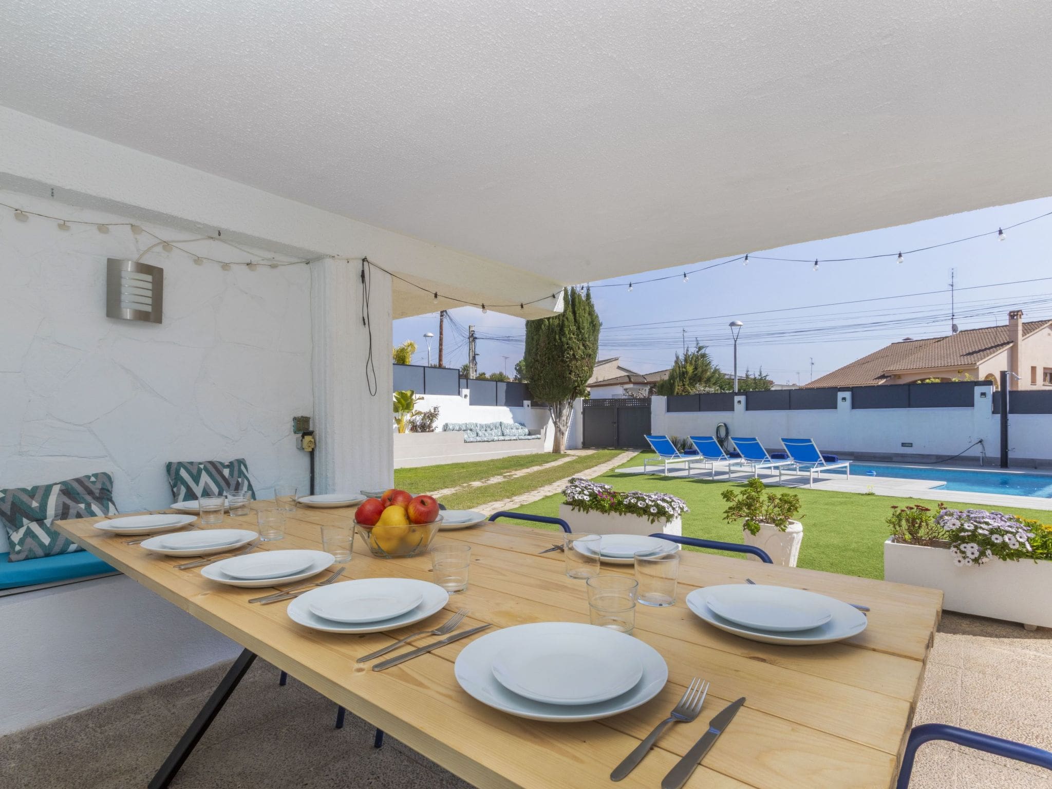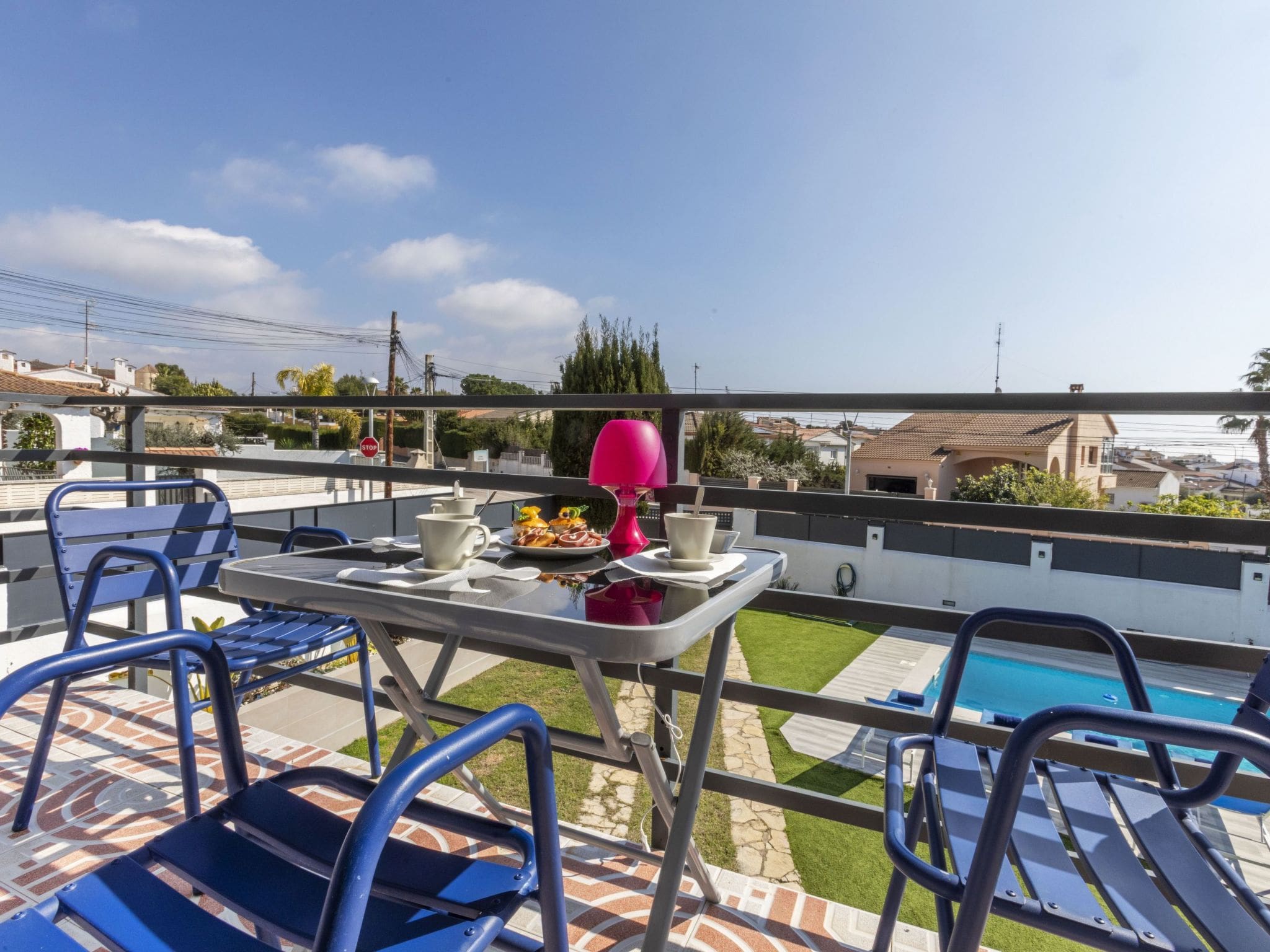 Garden furniture throughout the space allows guests to enjoy the Mediterranean climate in comfort, whether seeking morning coffee spots, afternoon reading nooks, or evening gathering areas. The well-maintained grounds offer privacy and serenity, with pool maintenance handled professionally.