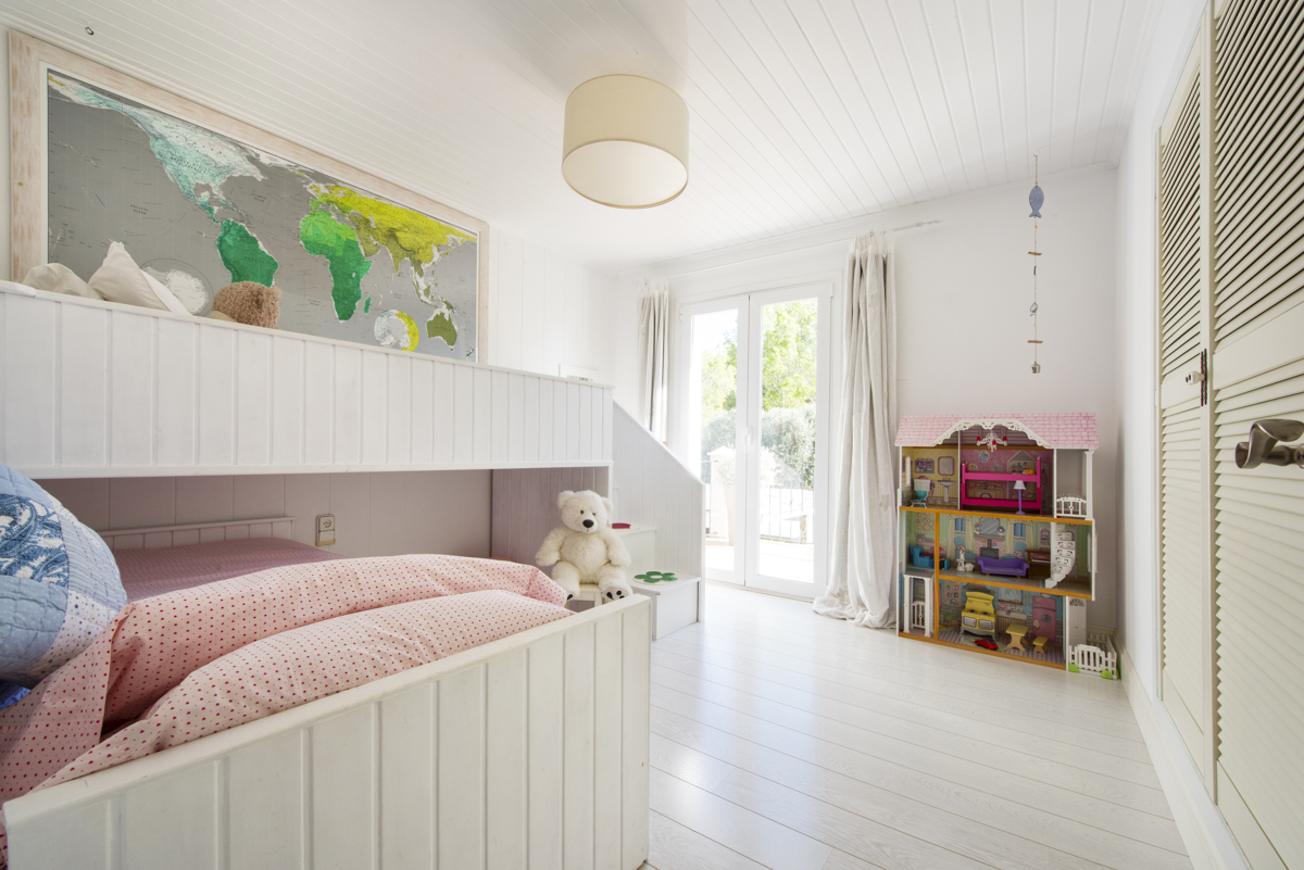 Entering the property via the front or rear door gives you direct access to the ground floor living area. Off of the open-plan living area which incorporates a cosy lounge with wall mounted plasma TV, spacious dining area and bright modern fully equipped kitchen, you’ll find the well-appointed bedrooms. The property has 4 bedrooms with bedrooms 1,2 and 3 located in the main house. The master bedroom has an en-suite bathroom and bedrooms 2 and 3 share a large family bathroom with huge jet bath tub! Bedroom 2 is a twin bedroom and bedroom 3 is a children’s room that consists of bunk beds with an extra pull out bed underneath the lower bunk therefore a 3rd child can sleep here enabling the villa to sleep 9. Bedroom 4 is in a separate annex with en-suite shower room and conveniently opens out onto a terrace and outside covered kitchen area. The exterior kitchen, with views over the garden, is also fully equipped and here you will find the gas BBQ.