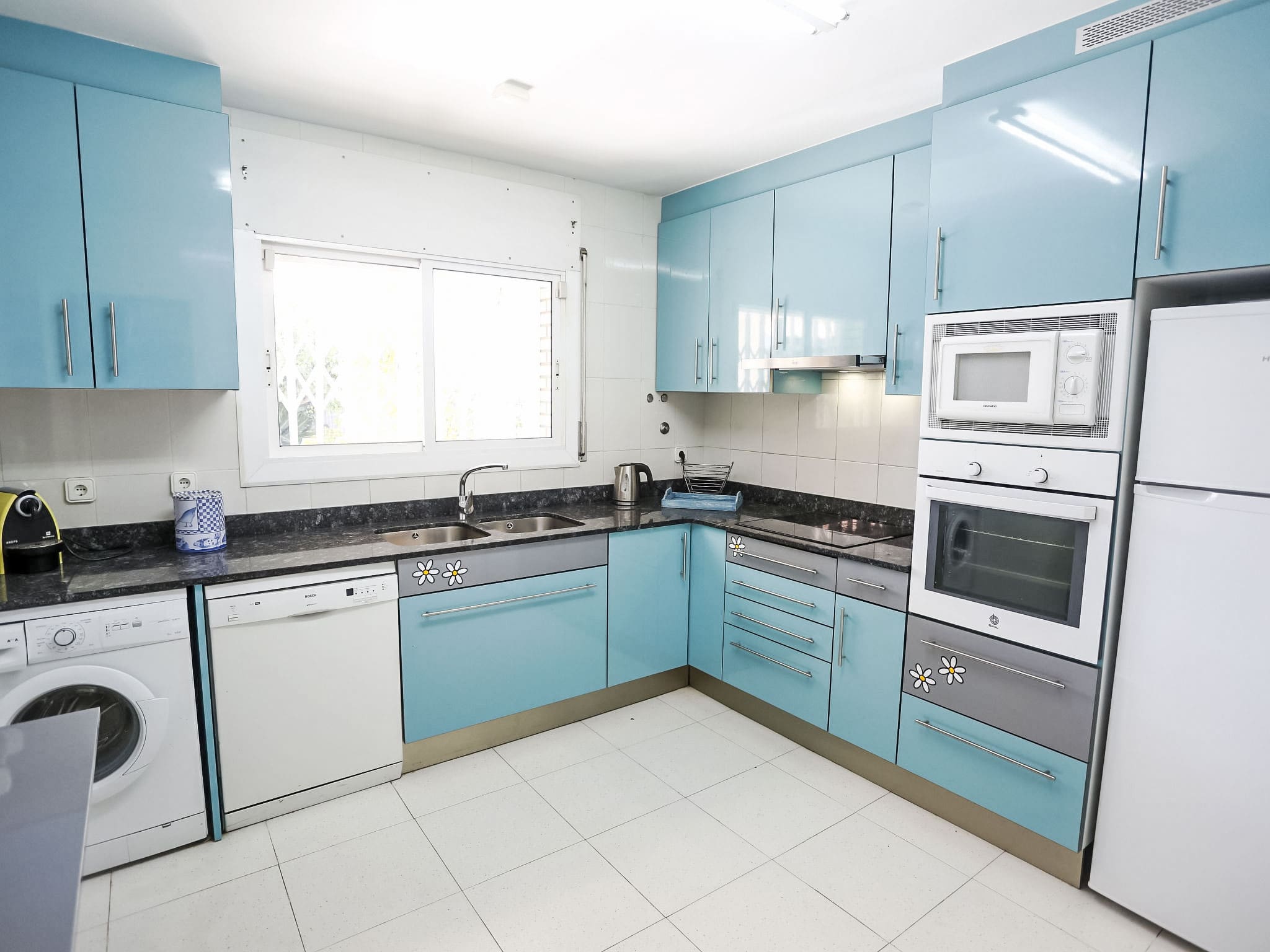 The contemporary kitchen comes fully equipped with 6 cooking rings, dishwasher, microwave and Nespresso coffee machine, making self-catering a pleasure. Modern amenities include complimentary WiFi throughout, washing machine, hair dryer and baby equipment including cot and high chair for families travelling with young children.