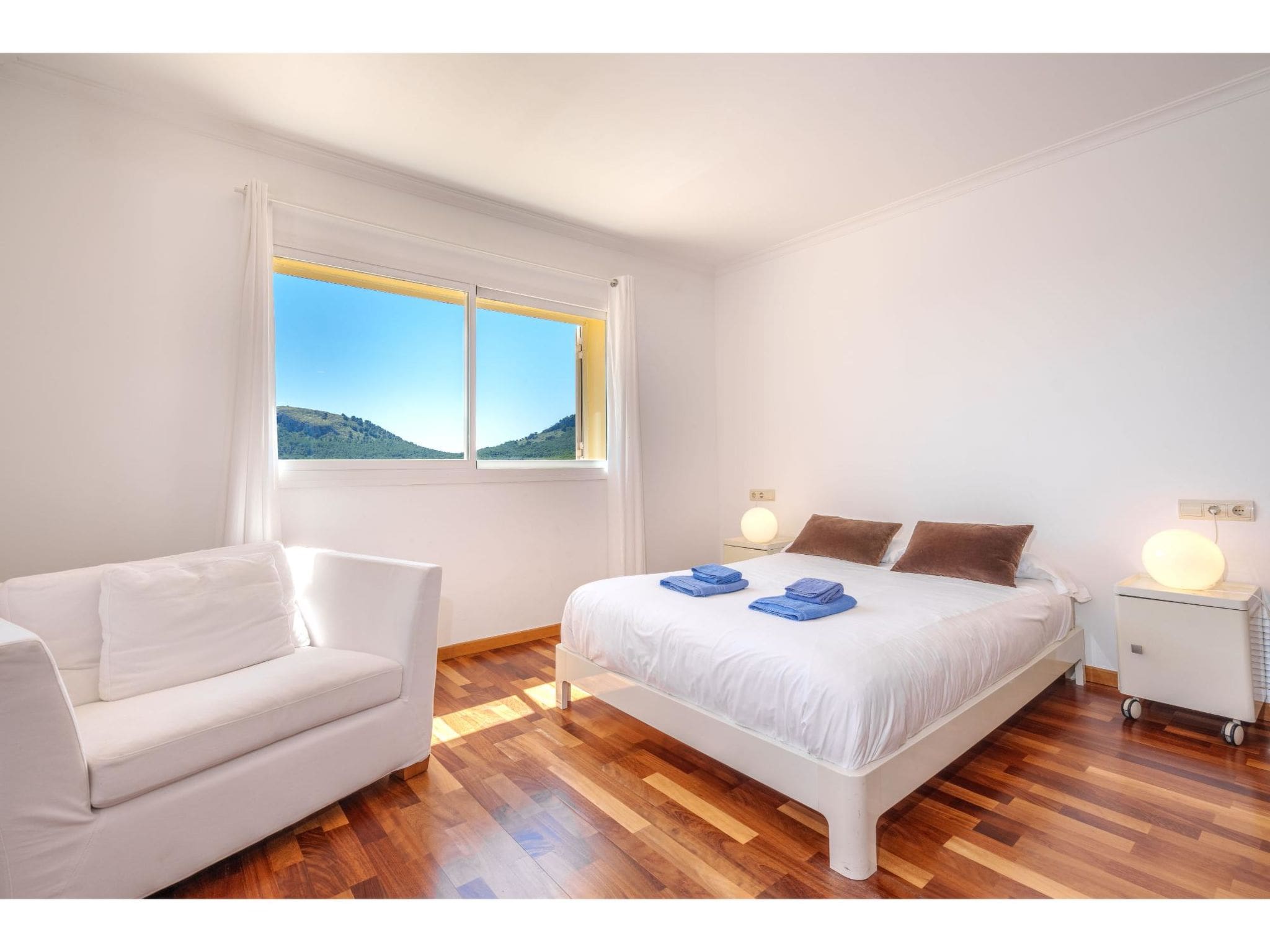 Four comfortable bedrooms accommodate up to eight guests, each fitted with air conditioning for year-round comfort. The master suite features a luxurious bathroom with both bath and shower, while two additional bathrooms ensure convenience for larger groups. Parquet flooring, double-glazed windows, and contemporary design create an atmosphere of refined relaxation.