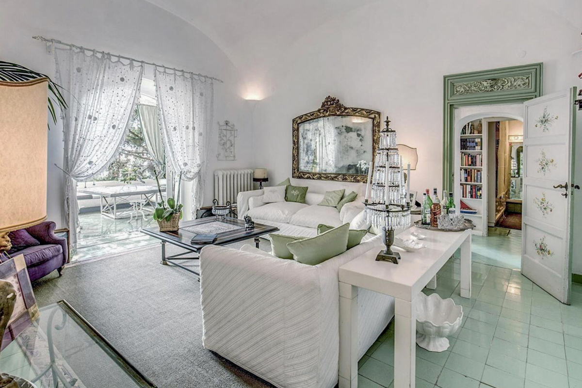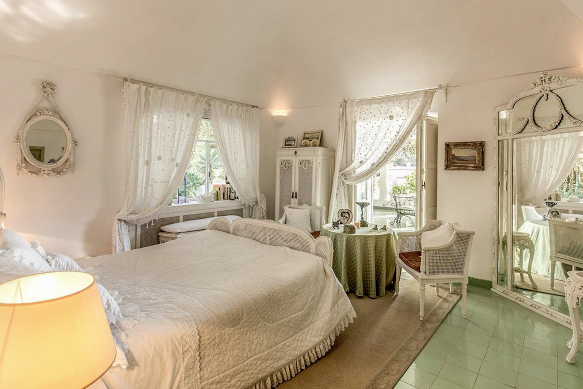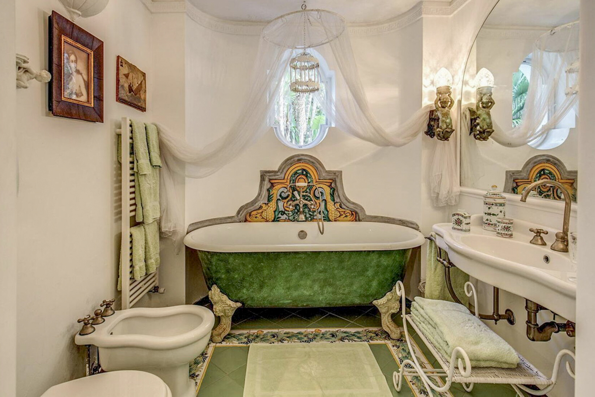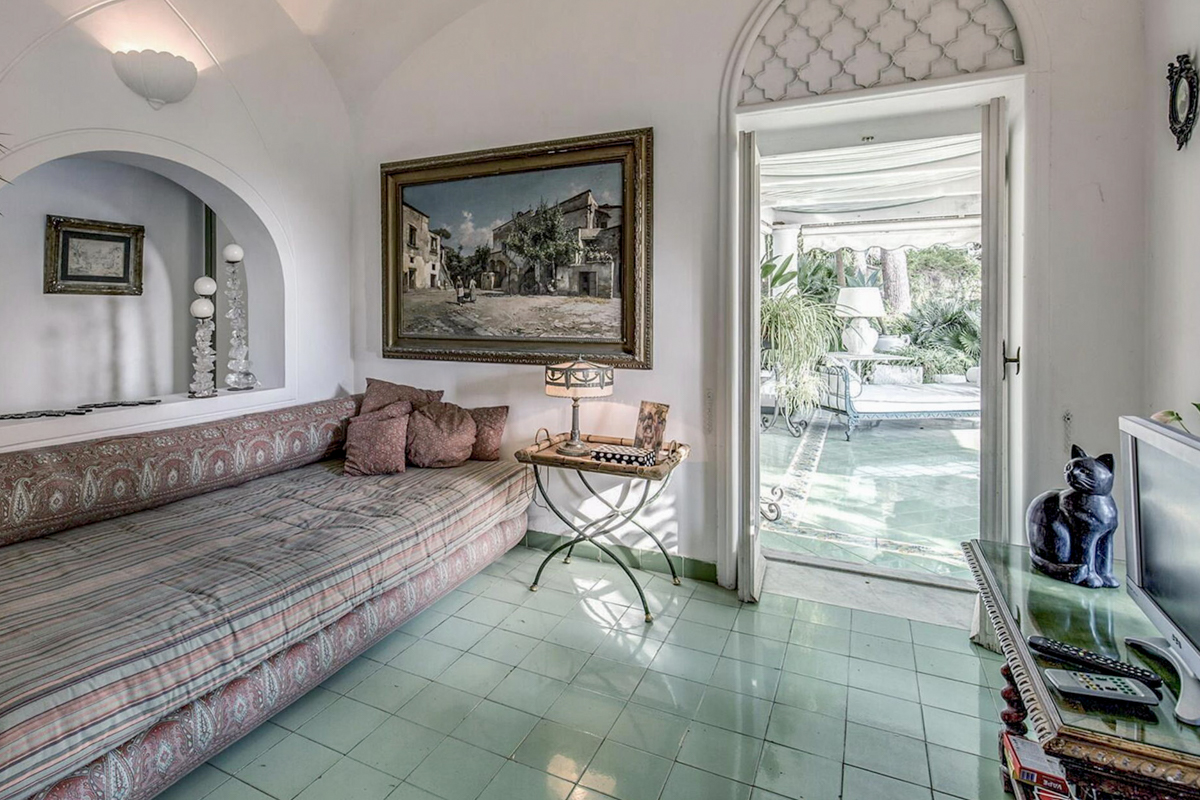 Cyathea is a stunning holiday home immersed in greenery in a delightful corner of Capri, an island in southern Italy. Built in the early 1950s and recently renovated, the bright, airy villa is projected in a typical Caprese style. It is surrounded by exotic vegetation, including maritime pine, prickly pears, and olive and cypress trees, all offering much-appreciated shade for relaxing. Inside, 17th-century prints adorn the walls and fascinating antiques and furniture from the 19th century are scattered around. These time-honoured features are elegantly combined with contemporary items. Guests can unwind in the large living room with sofas and a TV corner, from where there is direct access to the idyllic terrace immersed in greenery. All except one of the bedrooms are located on the first floor and have double or French beds, allowing various groups to find the most comfortable sleeping solution. Most bedrooms have en-suite bathrooms, some even with free-standing claw-foot bathtubs. The kitchen is equally charming, with bright green tiles and all the equipment necessary to whip up a feast. The outdoor terrace is lovely and is perfect for drinking your morning coffee. Elsewhere on the grounds, you can find more quiet corners with garden furniture. You’ll find it hard to leave this paradise, but the island has secret coves and sea caves you wouldn’t want to miss. The most famous one is the Blue Grotto, which boasts crystal clear turquoise waters and is just a 15-minute walk from the property. A small beach for snorkelling and swimming is also nearby when you want to refresh yourself on a hot day, and a street full of restaurants, nightclubs and boutiques is also within reach for fashionable evenings out. Marina Grande, the main town and port on the island, is where you’ll most likely start your holiday, as it boasts a harbour from where boats and ferries leave for the mainland. It’s an excellent place for strolling along the promenade, shopping for souvenirs or enjoying an aperitif in the many bars.