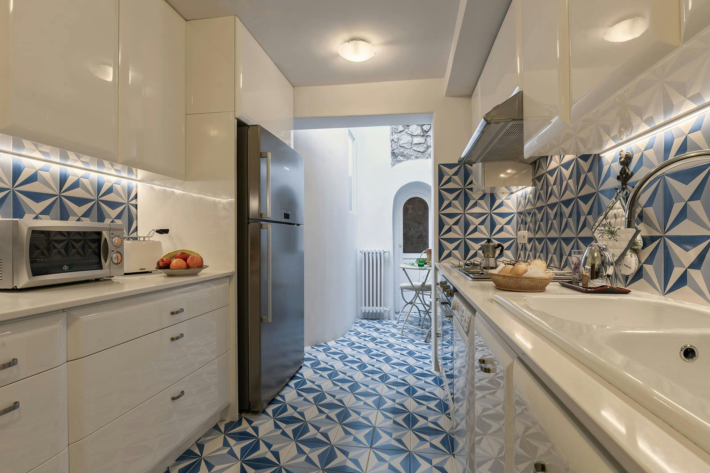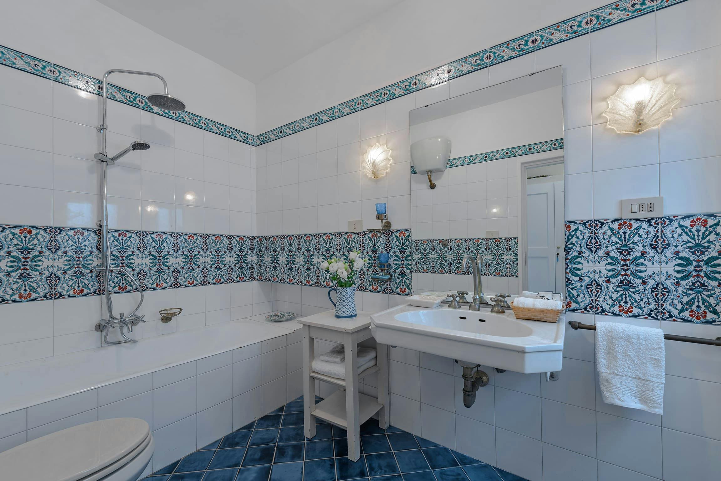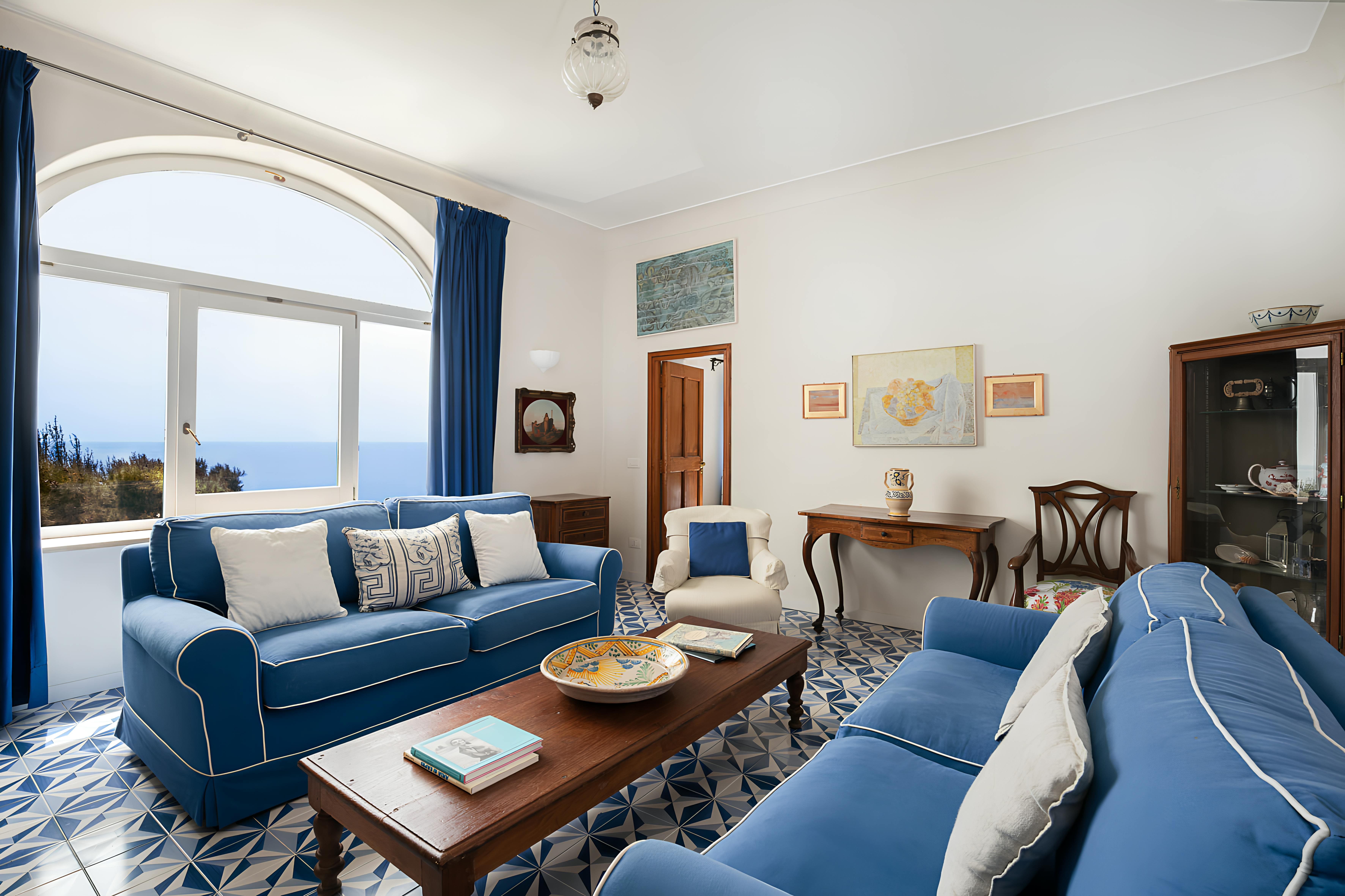 Step inside to discover a harmonious blend of Caprese charm and contemporary design. The villa boasts four beautifully appointed bedrooms, each with a private bathroom, ensuring comfort and privacy for up to eight guests. The interiors feature elegant blue and white tiles, exposed stone walls, and expansive windows that frame the stunning coastal scenery. The spacious living area is perfect for relaxation, while the fully equipped kitchen caters to culinary enthusiasts eager to savor Italian cuisine in the comfort of their own villa.