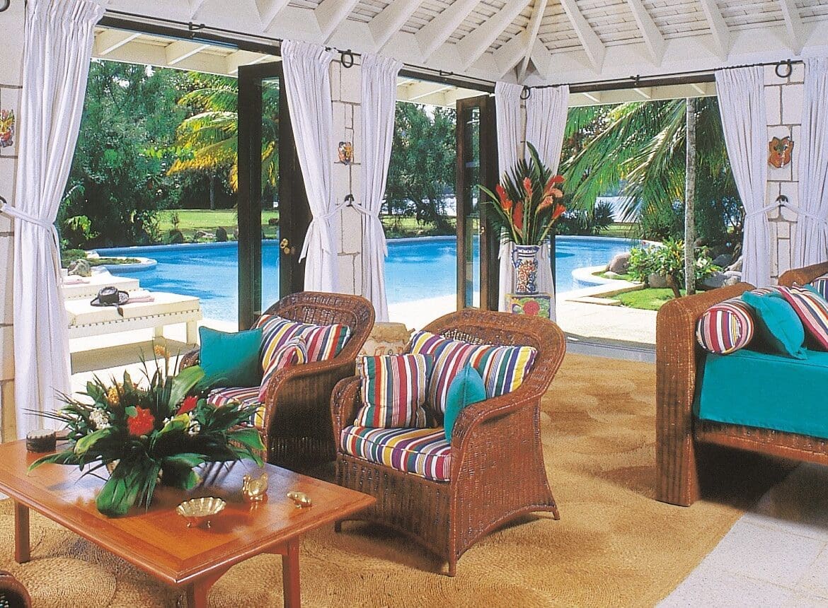 Meals here merit special attention. The Noble House cook has completed the Villas by Linda Smith Gourmet Cuisine Course and earned the chef’s emblem. Breakfasts cooked to order are served on the main verandah overlooking the groomed gardens and sea just beyond. Lunches are served by the pool or beach or on the shaded verandah. Dinners for special celebrations can be served in the formal dining room under an elegant crystal chandelier or less formally on the open-air verandah.