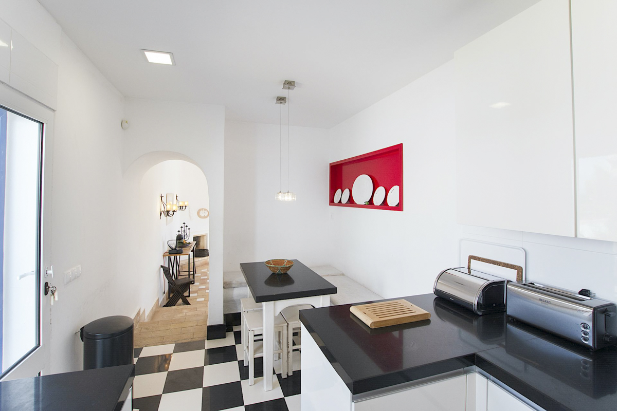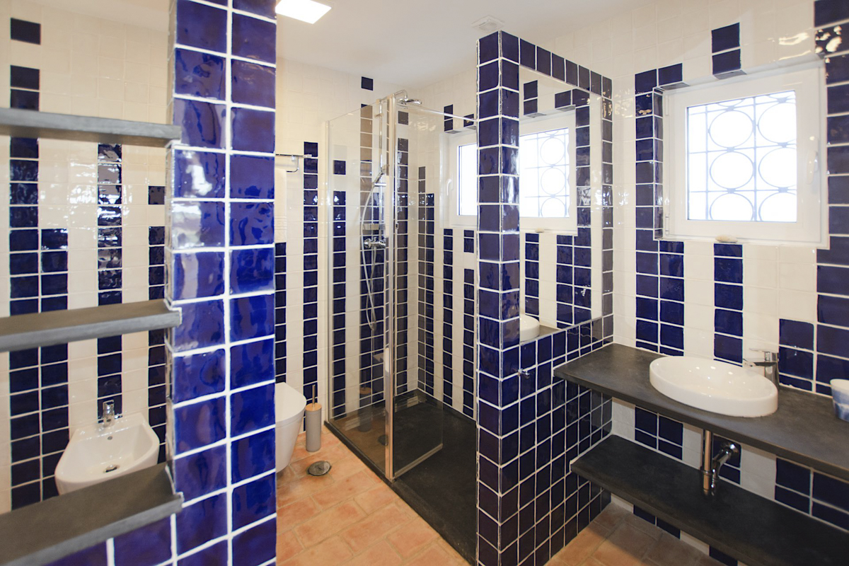 Villa Alfie is mostly designed on one level with one bedroom on the lower floor. The living room is enormous, with two built-in seating arrangements, a fireplace and a television area. There is also a games table for some family fun. The room features attractive arches and many windows and doors, bathing the room in light. There is easily enough room for the whole holiday group to be inside. However, the outside areas are pretty incredible, so you are likely to be outside most of the time! The kitchen is very modern and sleek with excellent appliances for your self-catering holiday. The dining room is very attractive with a lovely fireplace. Four of the six-bedroom suites are located on this level. One features a double bed and ensuite bathroom with a shower, another offers a double bed and ensuite with a bath, and the final two offer twin beds and ensuite shower rooms. There is also a handy laundry room.