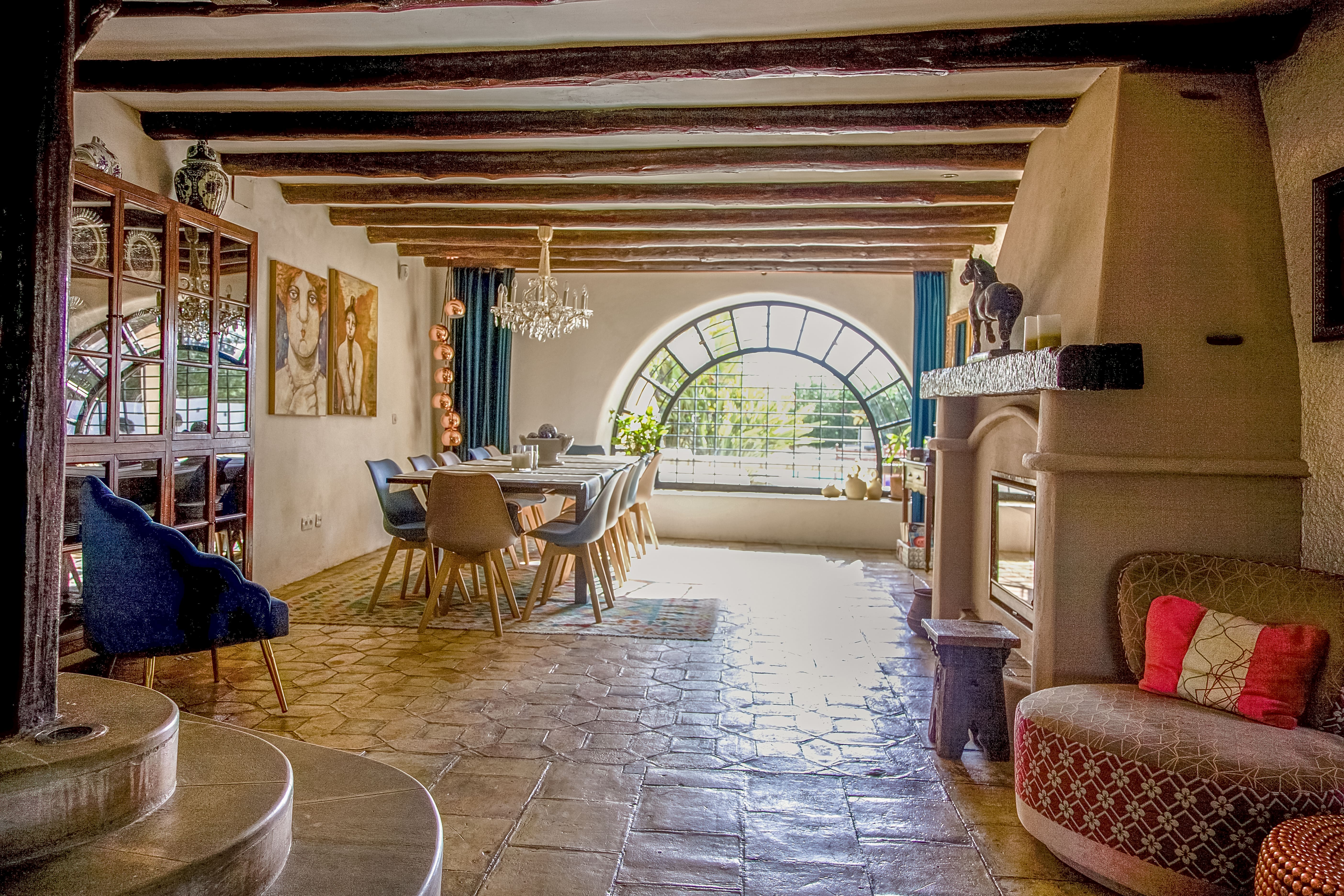 Step inside to discover a harmonious blend of Moroccan-style charm and rustic elegance. The villa boasts a spacious main house with five bedrooms and an additional four-bedroom bungalow, ensuring ample space for groups or families. Each suite-sized bedroom exudes comfort, adorned with intricate mosaic tiles and plush furnishings. The vaulted TV room invites relaxation, while the master bathroom, with its expansive soaking tub and panoramic views, promises a serene escape.