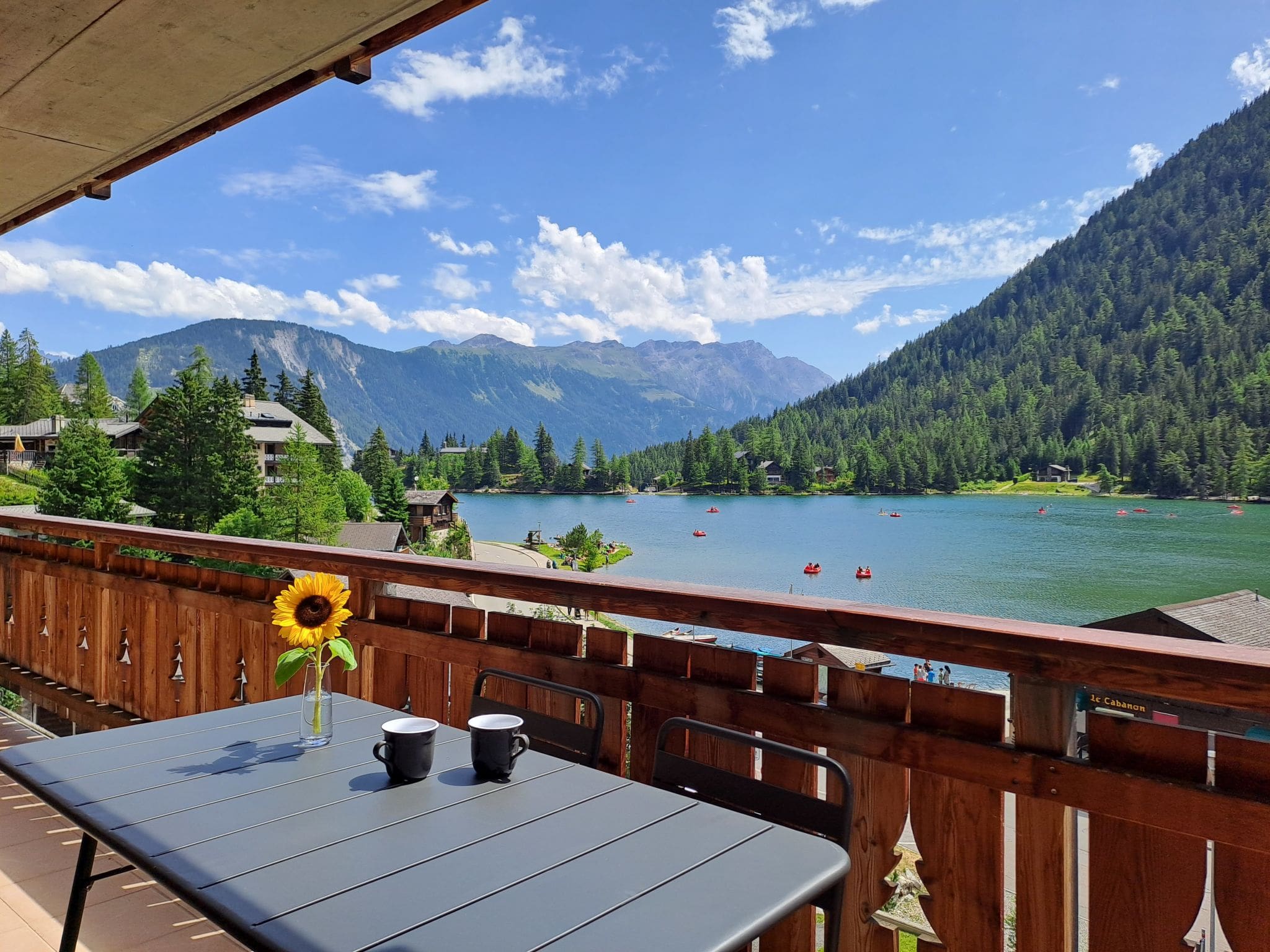 Step onto the expansive 41-square-metre balcony to discover one of the property’s most compelling features. This south-facing outdoor sanctuary offers uninterrupted panoramic views across Lake Champex to the dramatic alpine peaks beyond. Furnished with comfortable outdoor seating and deck chairs, the terrace provides an idyllic setting for morning coffee while watching the sunrise illuminate the mountains, or evening aperitifs as the day’s final light reflects off the lake’s mirror-like surface.