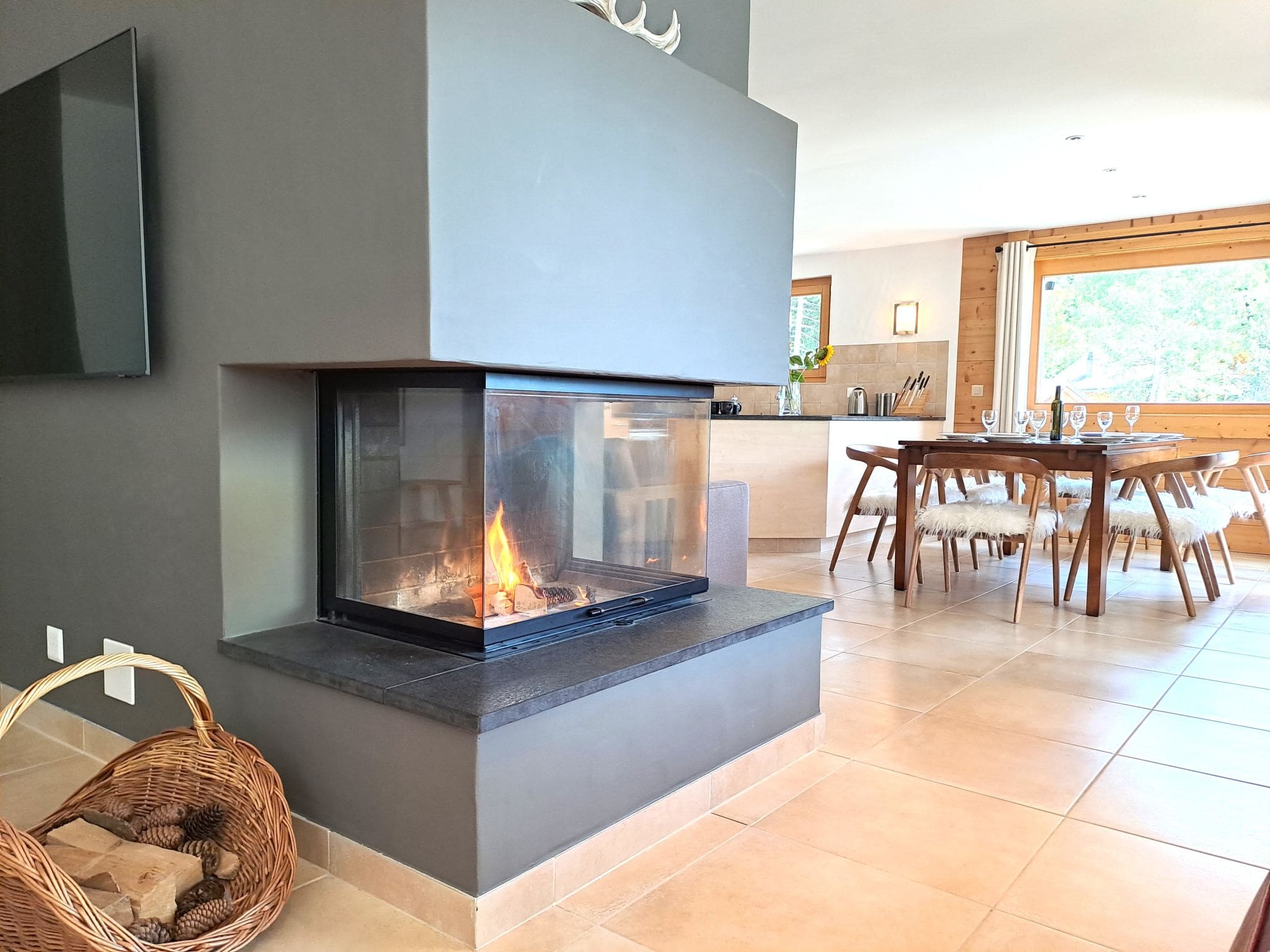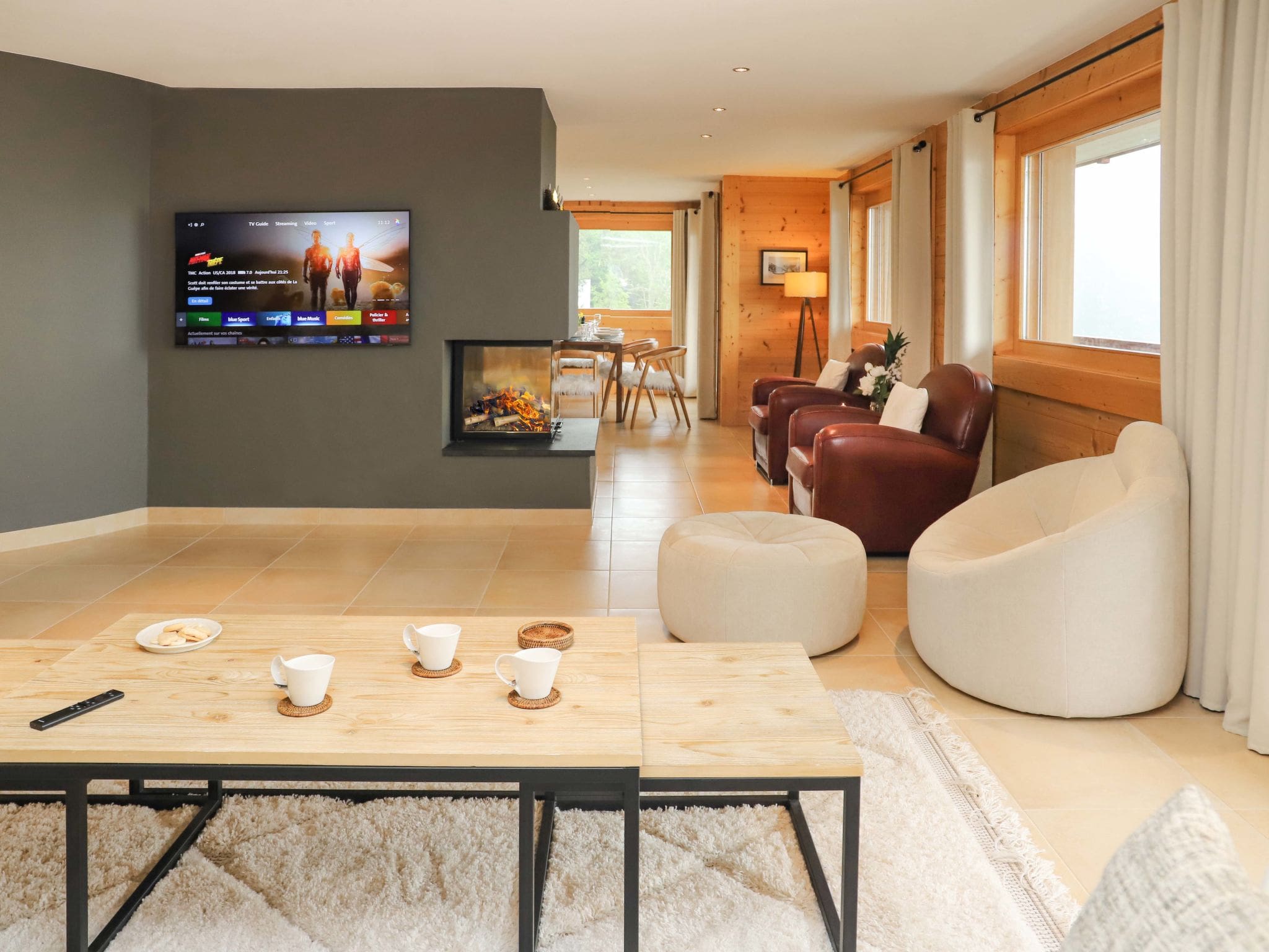 Spanning the entire third floor of the prestigious Les Mayens residence, this contemporary 4-bedroom chalet combines modern luxury with traditional alpine charm. The open-plan living and dining area features floor-to-ceiling panoramic windows that frame breathtaking views of Lake Champex and the surrounding peaks. A striking open-hearth fireplace creates a cozy focal point, perfect for après-ski gatherings or quiet evenings watching the sunset paint the mountains gold.