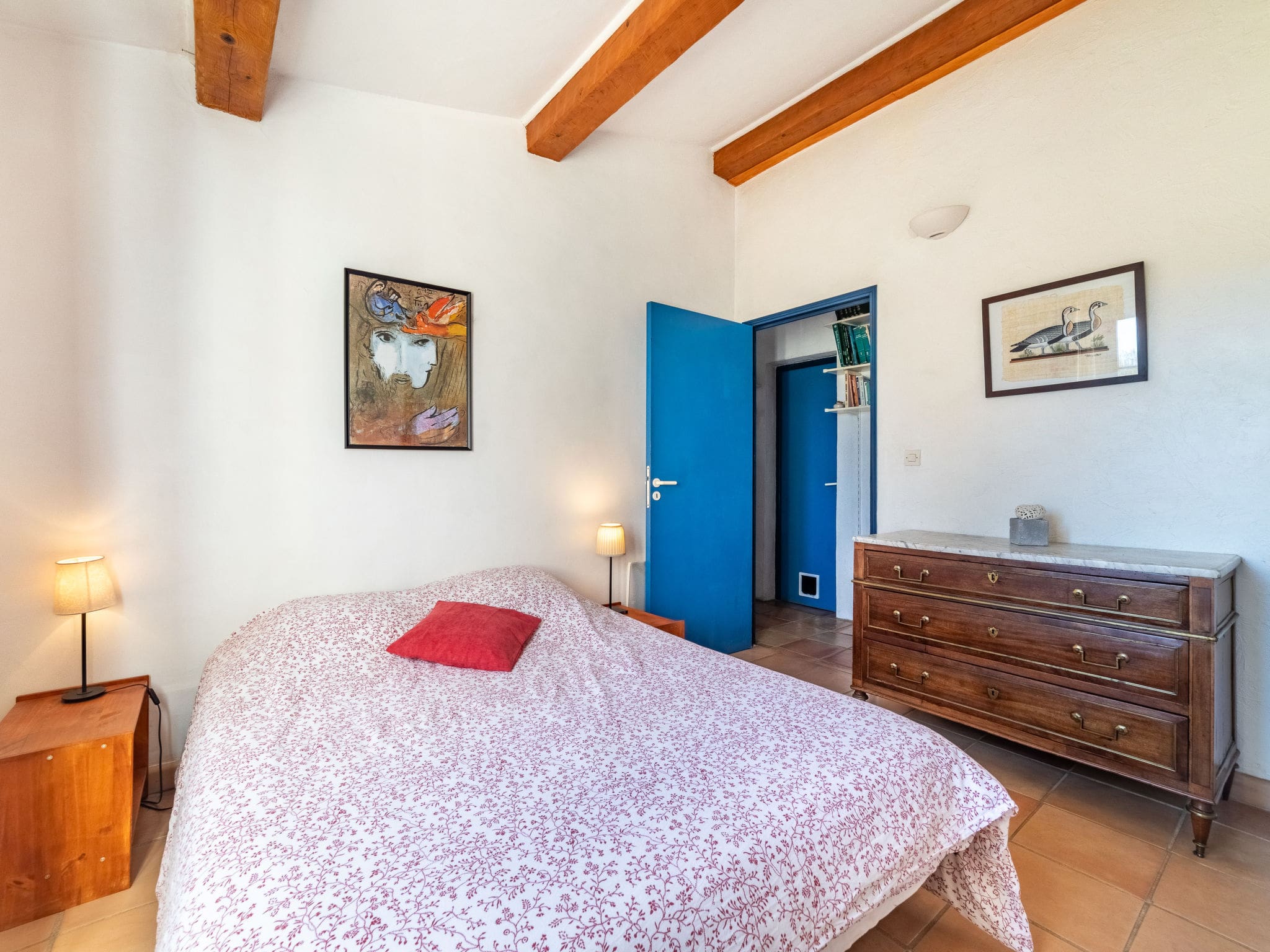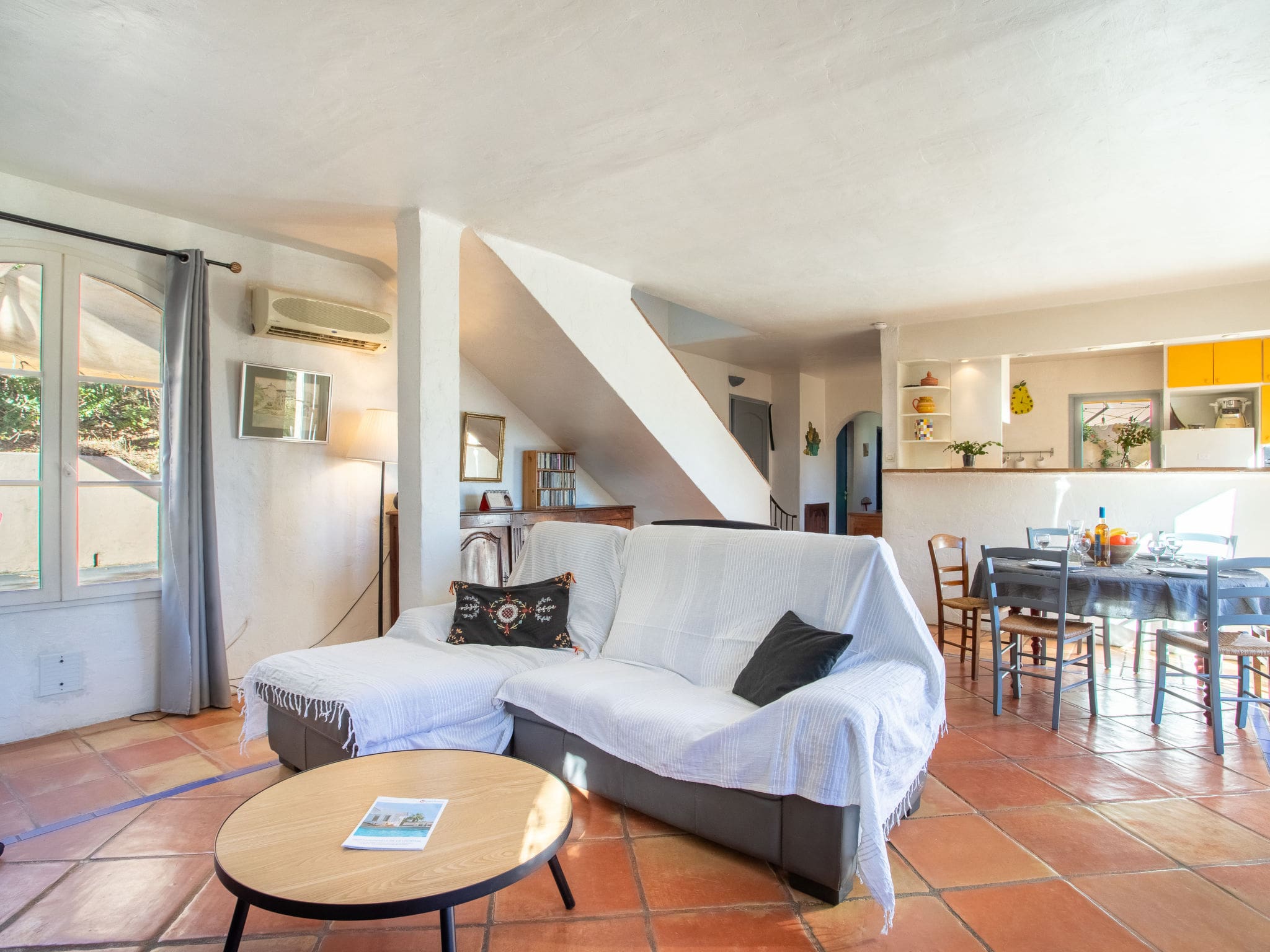 Spread across two thoughtfully designed levels, the villa combines traditional Provençal charm with modern amenities. The ground floor welcomes guests with an inviting living and dining area, complete with a decorative fireplace and air conditioning for year-round comfort. French doors open seamlessly to the outdoor terrace, creating a natural flow between indoor and outdoor living spaces. The contemporary open kitchen features premium appliances including induction hob, dishwasher, microwave, and Senseo coffee machine, making it ideal for preparing family meals or entertaining guests.