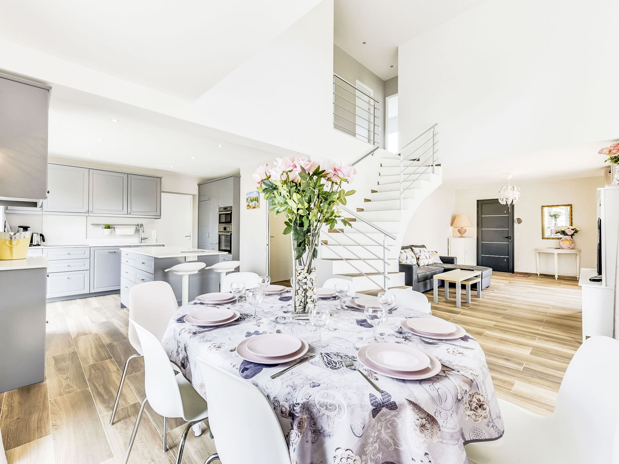 The heart of the home lies in the stunning open kitchen, equipped with premium appliances including an induction hob, dishwasher, microwave, and electric coffee machine. The central cooking island provides additional workspace and creates a natural gathering point for family meals and entertaining. A separate guest WC completes the ground floor layout.