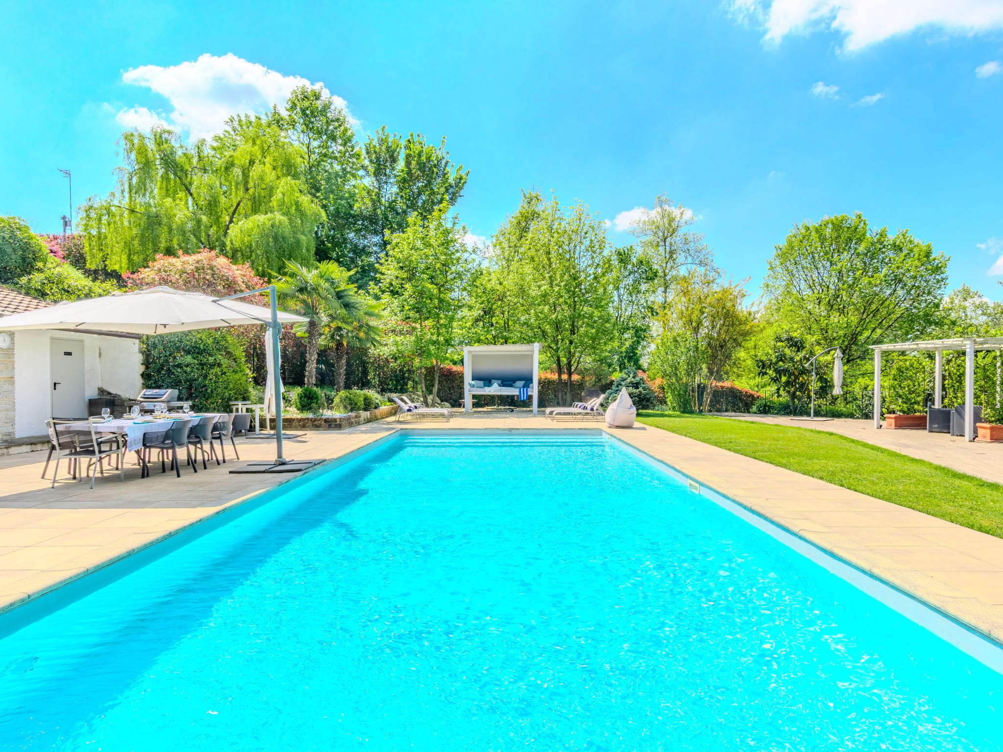 The villa’s crowning glory lies in its extensive outdoor spaces, dominated by a private swimming pool available from April through October. The large terraced garden, adorned with mature trees and pristine lawns, provides multiple areas for relaxation and entertainment. A spacious patio and terrace, furnished with deck chairs for six, offer the perfect vantage point for admiring the magnificent mountain and countryside views.