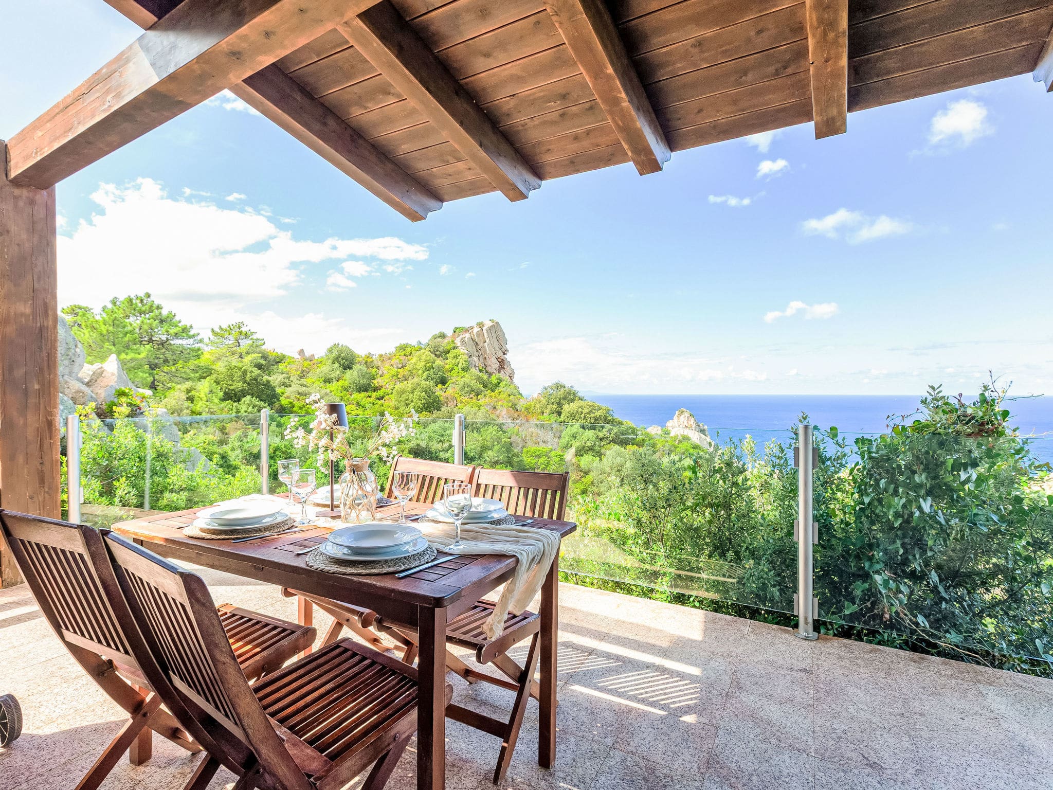 From these elevated outdoor spaces, guests can enjoy uninterrupted panoramic views across the azure Mediterranean, watching the interplay of light and shadow across the water throughout the day. The villa’s sunny position captures the golden Sardinian light from sunrise to sunset, creating an ever-changing canvas of natural beauty.