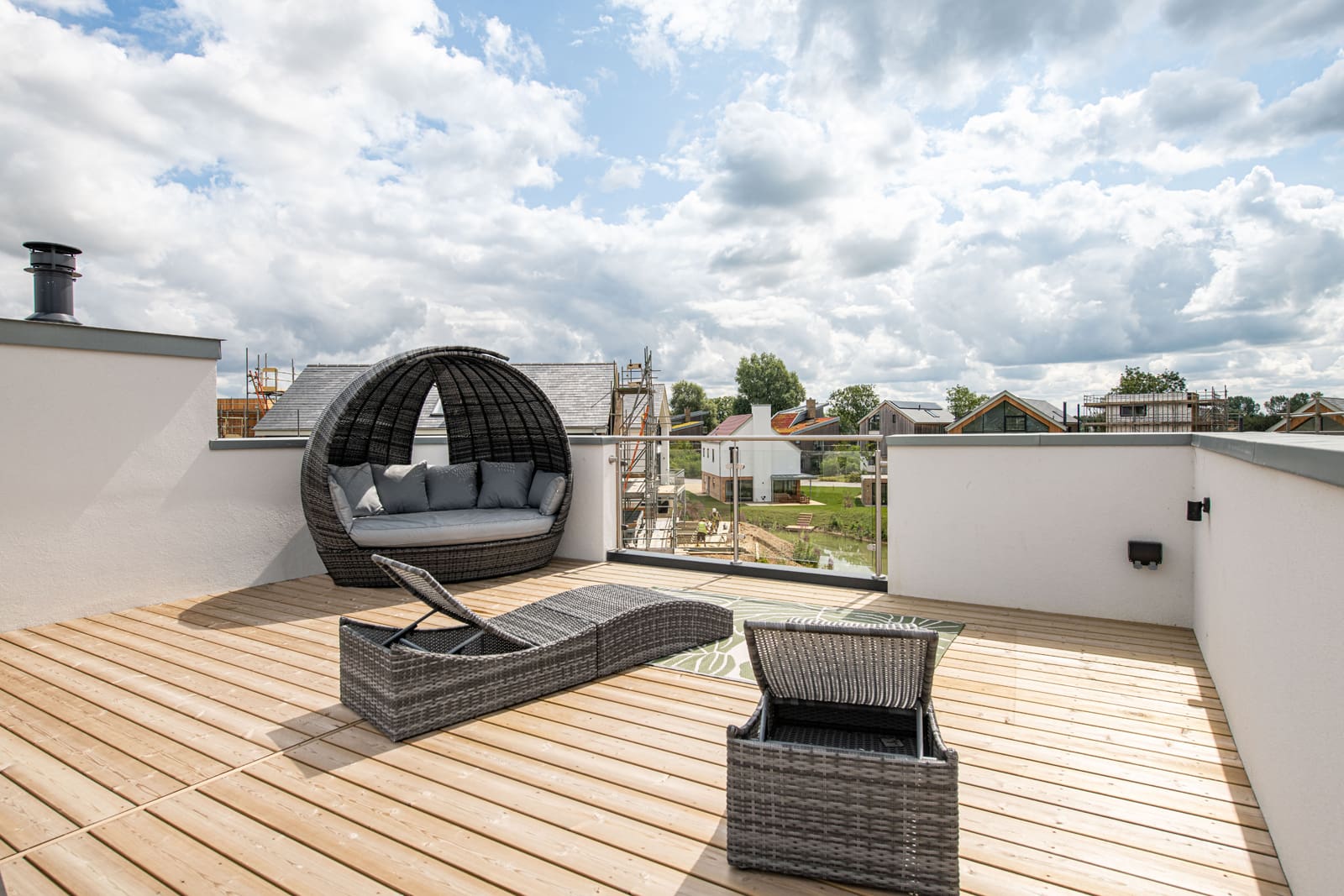 Step outside to discover the villa’s enchanting outdoor spaces. A private terrace with a hot tub overlooks Minety Lake, offering a tranquil spot to unwind. The villa’s private jetty allows direct access to a host of water sports, making it a haven for adventure enthusiasts. A swimming pool is perfect for a refreshing dip, while the lush garden provides a serene setting for outdoor dining and relaxation.