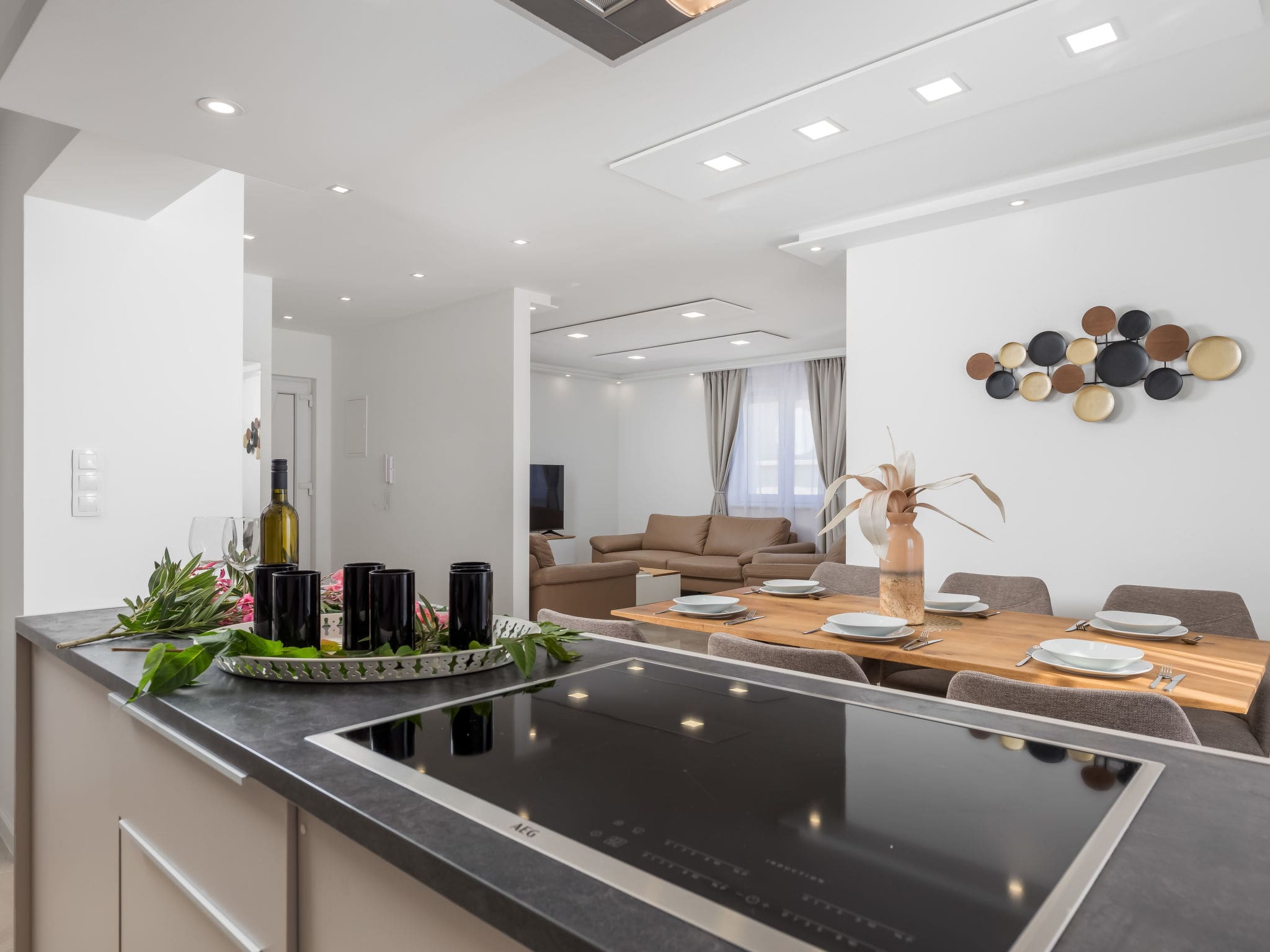 This impressive 175-square-meter property showcases modern Croatian architecture at its finest, with clean lines and premium finishes throughout. The ground floor welcomes guests with an elegant living and dining area featuring satellite television and air conditioning, seamlessly connecting to an open kitchen equipped with premium appliances including induction hobs, dishwasher, microwave, and electric coffee machine. Two beautifully appointed bedrooms, each with double beds and individual climate control, share this level alongside two pristine shower rooms.