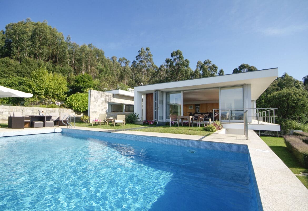 Both sea and river views can be enjoyed from the elevated setting of Casa Cristelo, with this stylish villa being situated close to where the Minho River meets the ocean and the sandy beaches of northern Portugal’s Caminha area.