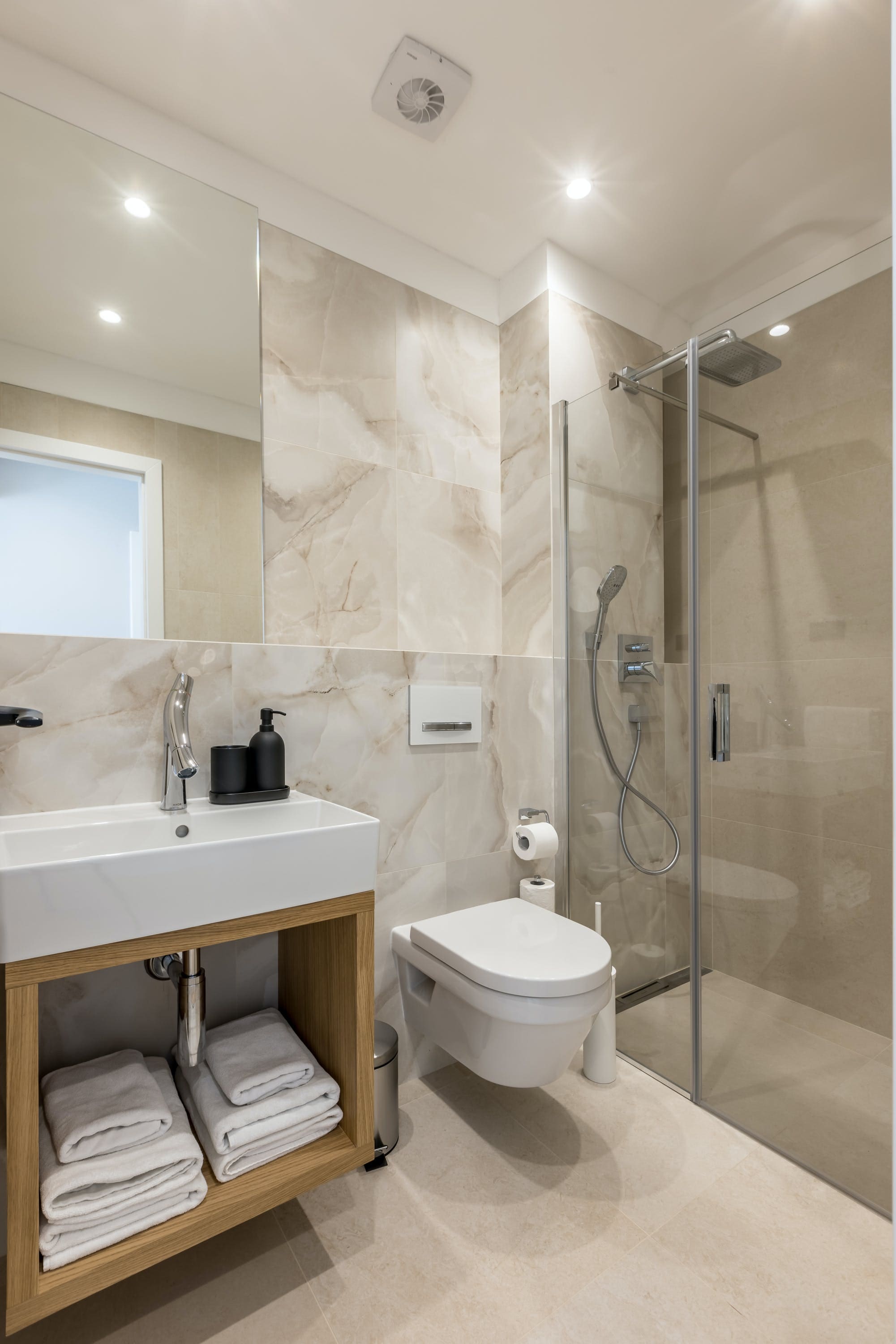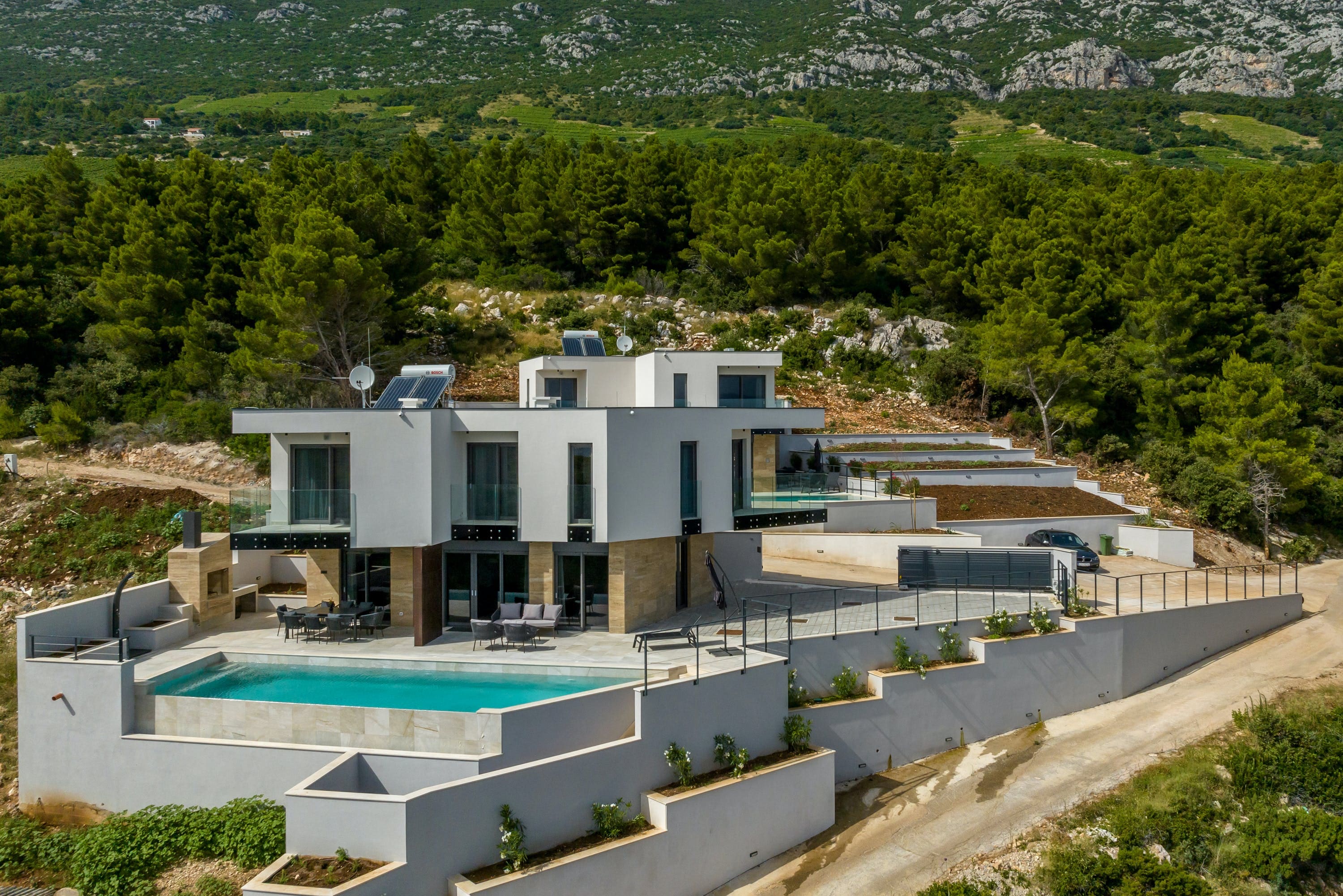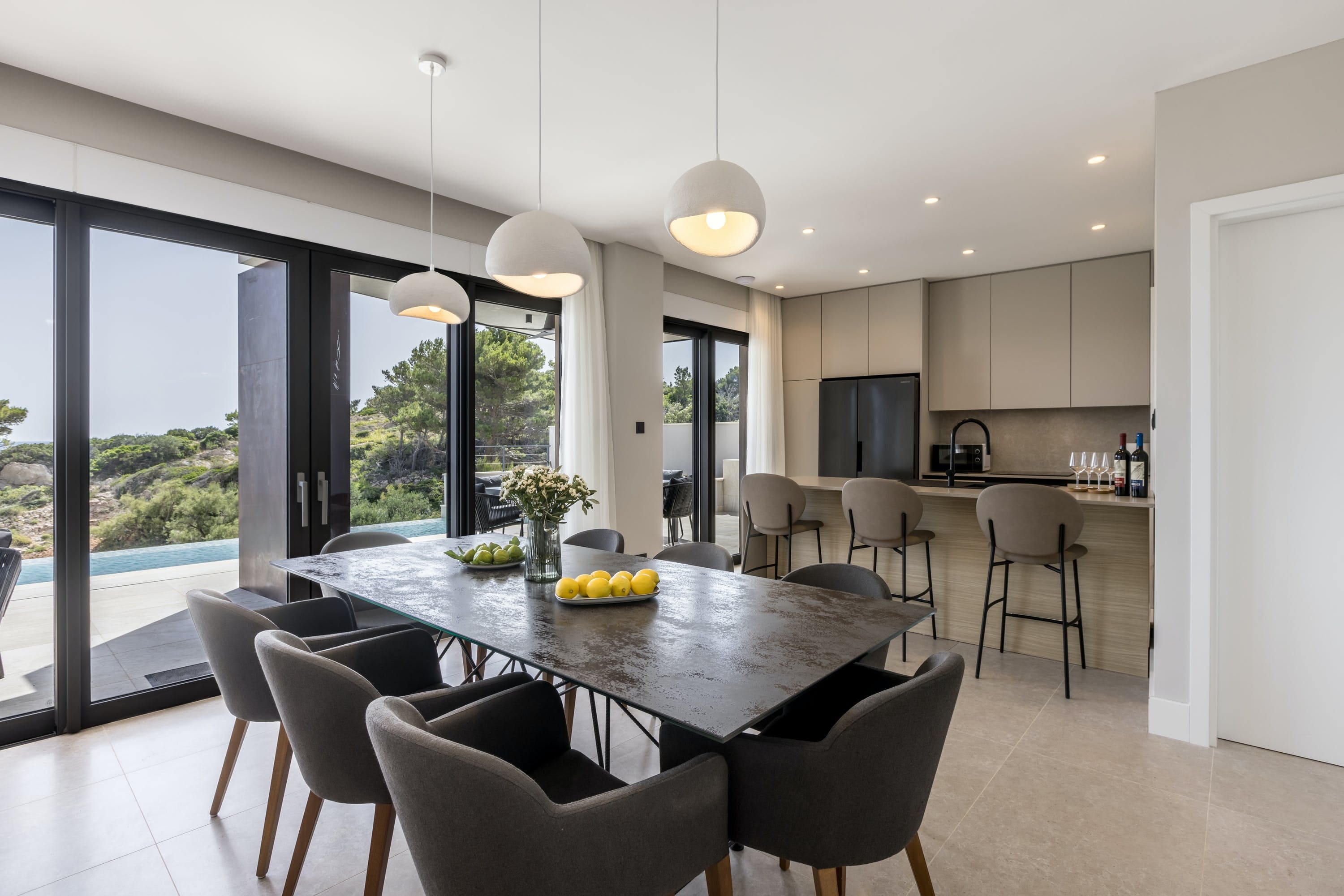 The villa’s interior is a showcase of modern elegance and comfort. With three beautifully appointed bedrooms, each featuring its own en-suite bathroom, guests are assured of privacy and relaxation. The open-concept living area is designed for both comfort and style, where large windows frame the stunning views of the Adriatic Sea. The fully equipped kitchen is ideal for preparing gourmet meals, and the dining area offers a seamless transition from indoor to alfresco dining on the terrace.