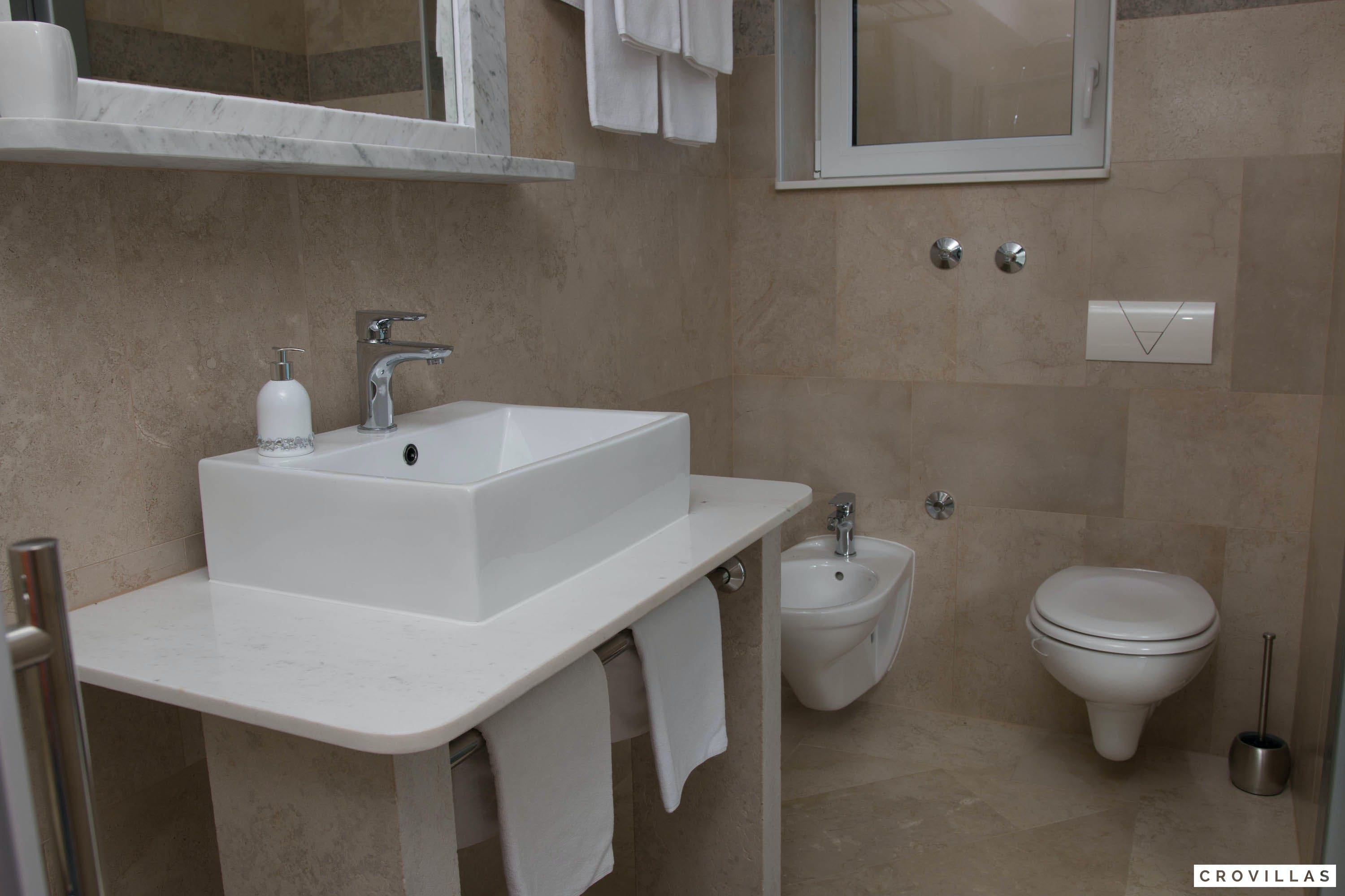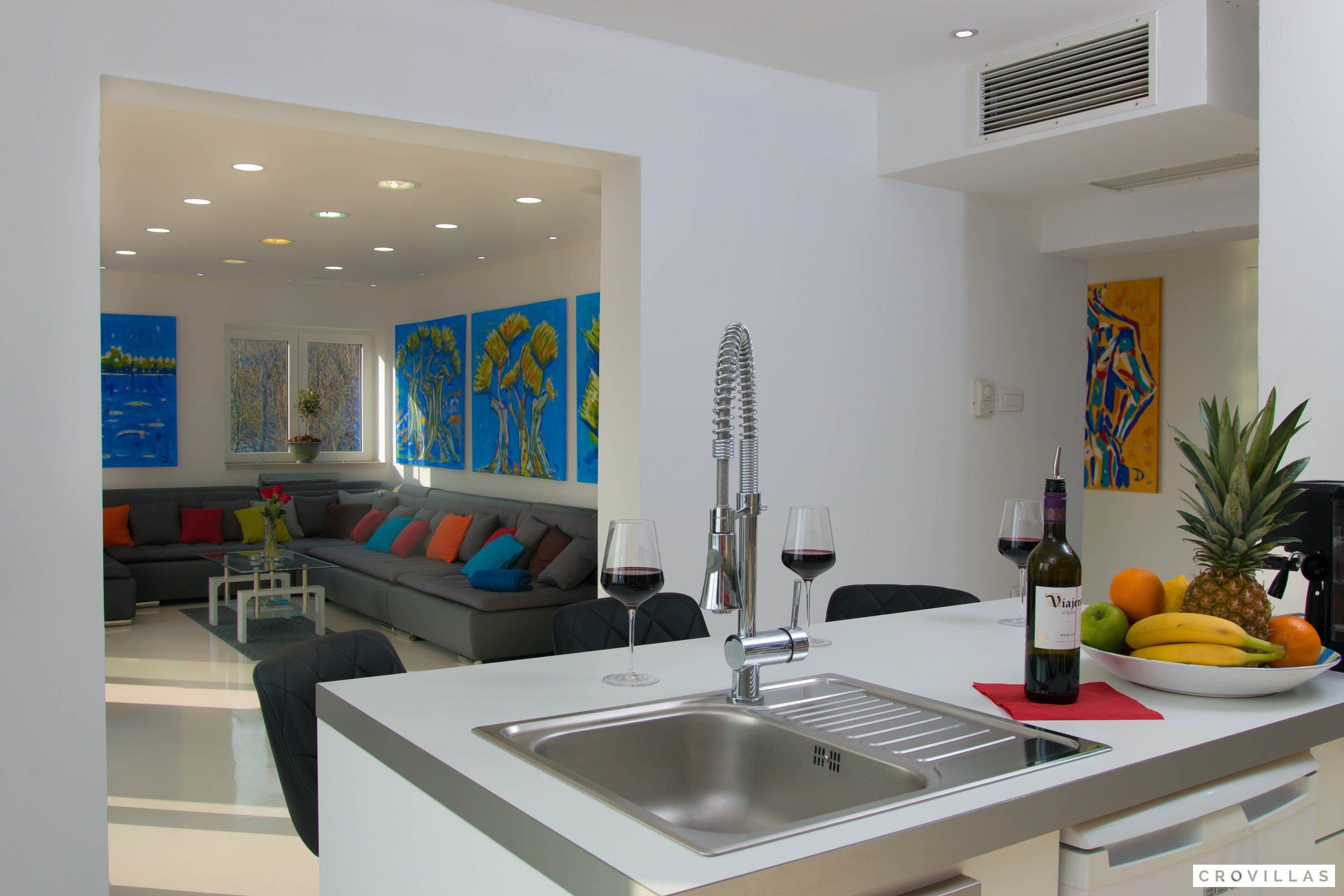 The interior of this luxury villa rental in Crikvenica is a masterpiece of modern design and comfort. The spacious living areas are adorned with vibrant artwork, creating a lively yet sophisticated ambiance. The state-of-the-art kitchen is fully equipped, perfect for crafting gourmet meals. Each of the four bedrooms boasts en-suite bathrooms, with one featuring a Jacuzzi for ultimate relaxation. The villa can accommodate up to eight guests, with an additional sofa bed for flexibility.