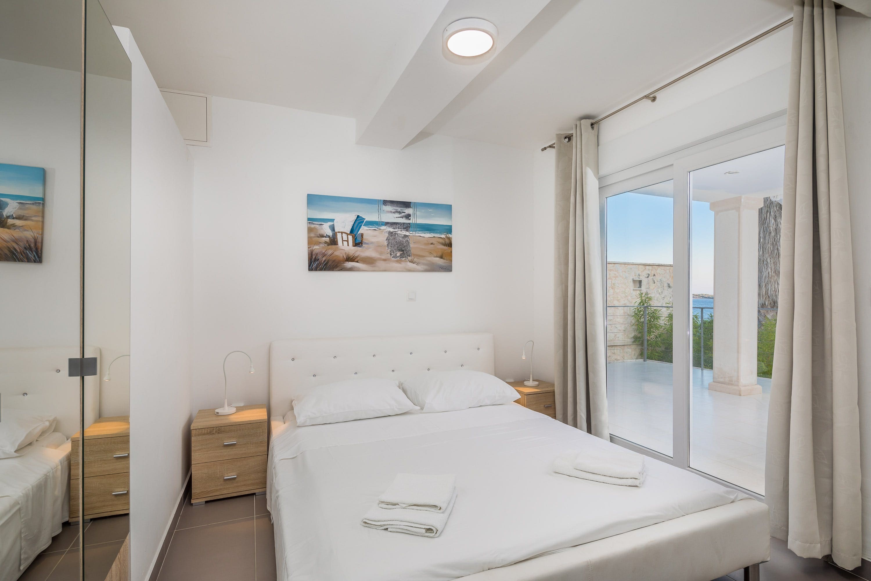 Step outside to explore the villa’s enchanting outdoor spaces. The terraced gardens lead down to a pristine swimming pool, ideal for leisurely swims under the Mediterranean sun. Relax on the sunbathing deck or take a short stroll to the private pier, where you can moor boats up to 25 meters long. The shallow beach nearby is perfect for children, offering safe and easy access to the crystal-clear waters of the Adriatic Sea.
