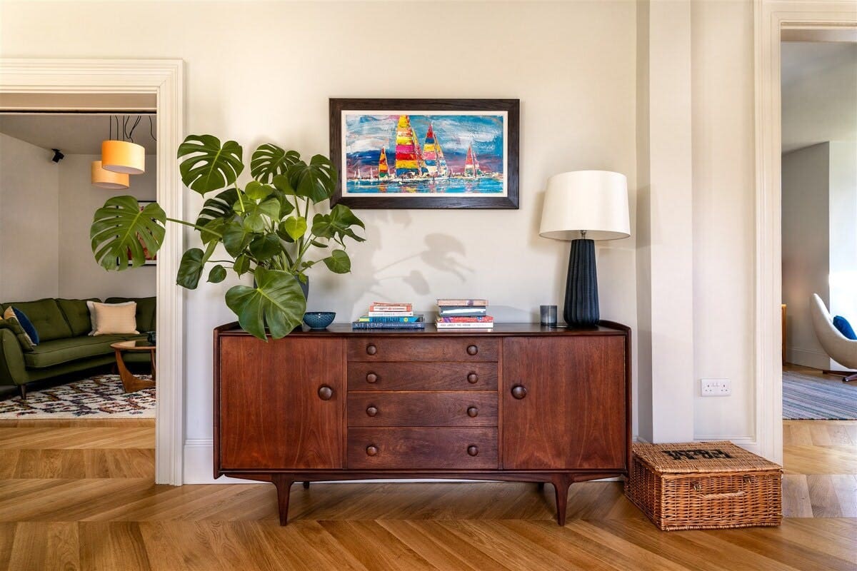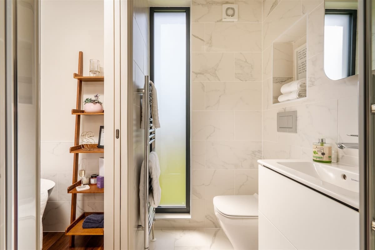 Step into a world of modern elegance inside House Dartwood Kingswear. This recently renovated Victorian home artfully blends contemporary design with classic charm. The open-plan living area features a seamless transition from indoor to outdoor spaces, allowing you to fully appreciate the spectacular views of the River Dart. The living room invites relaxation with its cozy fireplace, while the dining area, highlighted by a 1950s-inspired long table, provides a vibrant space for shared meals. Each bedroom is distinctively decorated in bright and bold colors, offering a unique retreat for guests. With four bedrooms, including one with bunk beds and another with a trundle bed, this house can comfortably accommodate up to 10 guests.