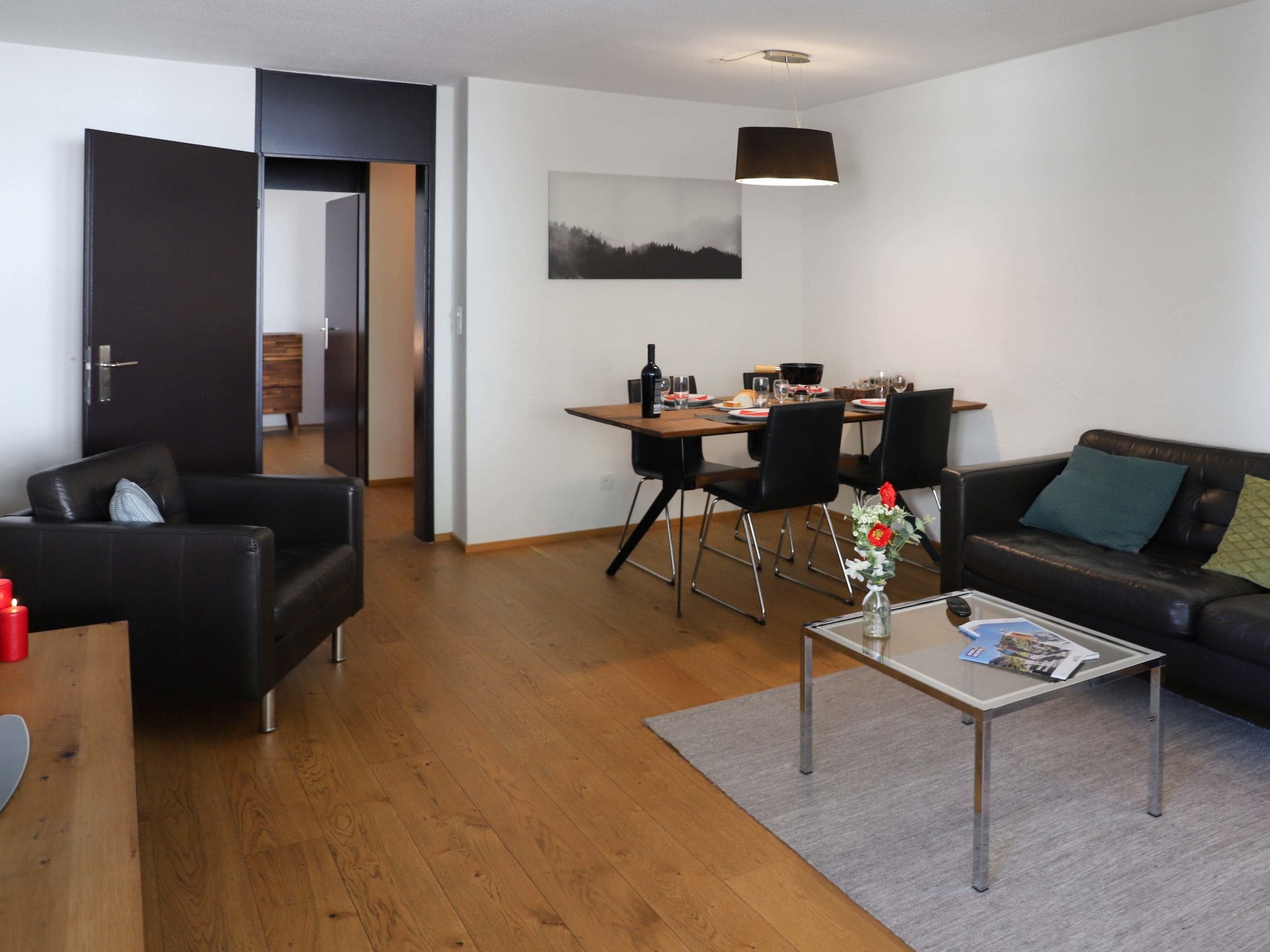 Recently renovated in 2017, this bright 75-square-meter apartment on the 7th floor showcases contemporary Swiss design with tasteful modern furnishings throughout. The spacious living and dining area features cable television and radio entertainment, with direct access to a west-facing terrace that frames spectacular views of the surrounding peaks. The apartment accommodates up to six guests across two well-appointed bedrooms, each offering different mountain perspectives and terrace access.